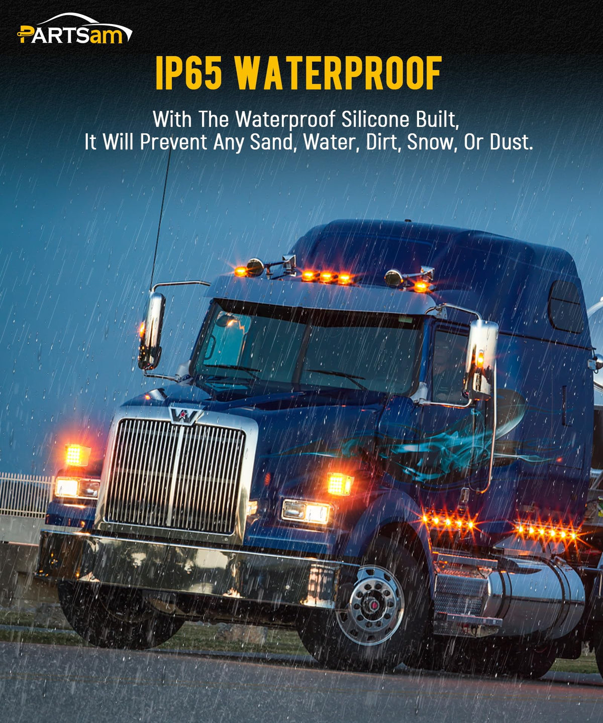 Q: Are these lights waterproof and suitable for all weather conditions?A: Yes, these LED lights are completely IP67 waterproof, making them suitable for use in heavy rain and harsh weather conditions. Their sealed moisture-proof design ensures durability and reliability, keeping your truck well-marked and safe under various environmental conditions.