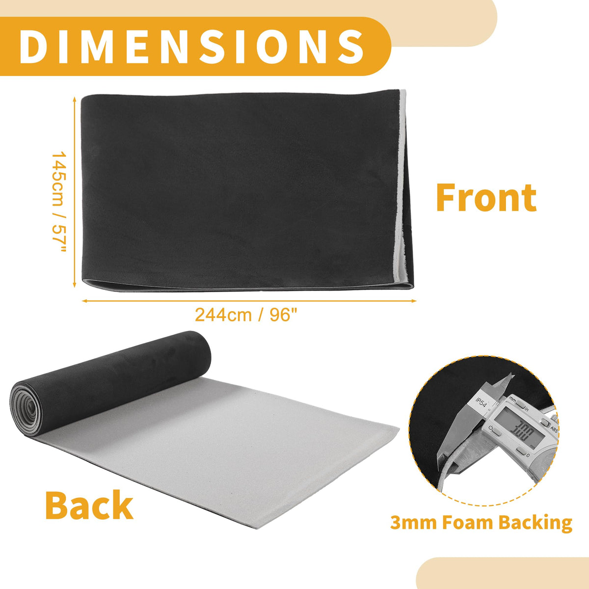 Fit for:Widely applied for cars, trucks, pickups, RVs, SUVs, marine, boats for automotive headliner, sunroof panel, seats, door panels, etc. It does a good job in interior trim upholstery, roof ceiling and steel wheel carpet lining, aging broken faded DIY repair replacement.Product Highlights:Our automotive headliner fabric is soft, durable and comfortable to touch to be a good choice as the interior trim repairing material to give your car a new look.It's clean and not easy to be deformed, which can protect the car interior from pets or other scratches and it's elastic to absorb shock and sound, and insulate heat.You can cut it to fit any size you want.Product Information:Material: Suede FabricColor: BlackSize: 244 x 145cm / 96'' x 57'' (L*W)Foam Backing: Yes, 3mm Foam BackingFabric Weight: 150GThickness: 3mmTips:The roof headliner is folded for you, if there are creases, don't worry, you can lay the roof headliner flat for a while and press it properly.Content:1 x Roof Headliner Suede Repair Fabric