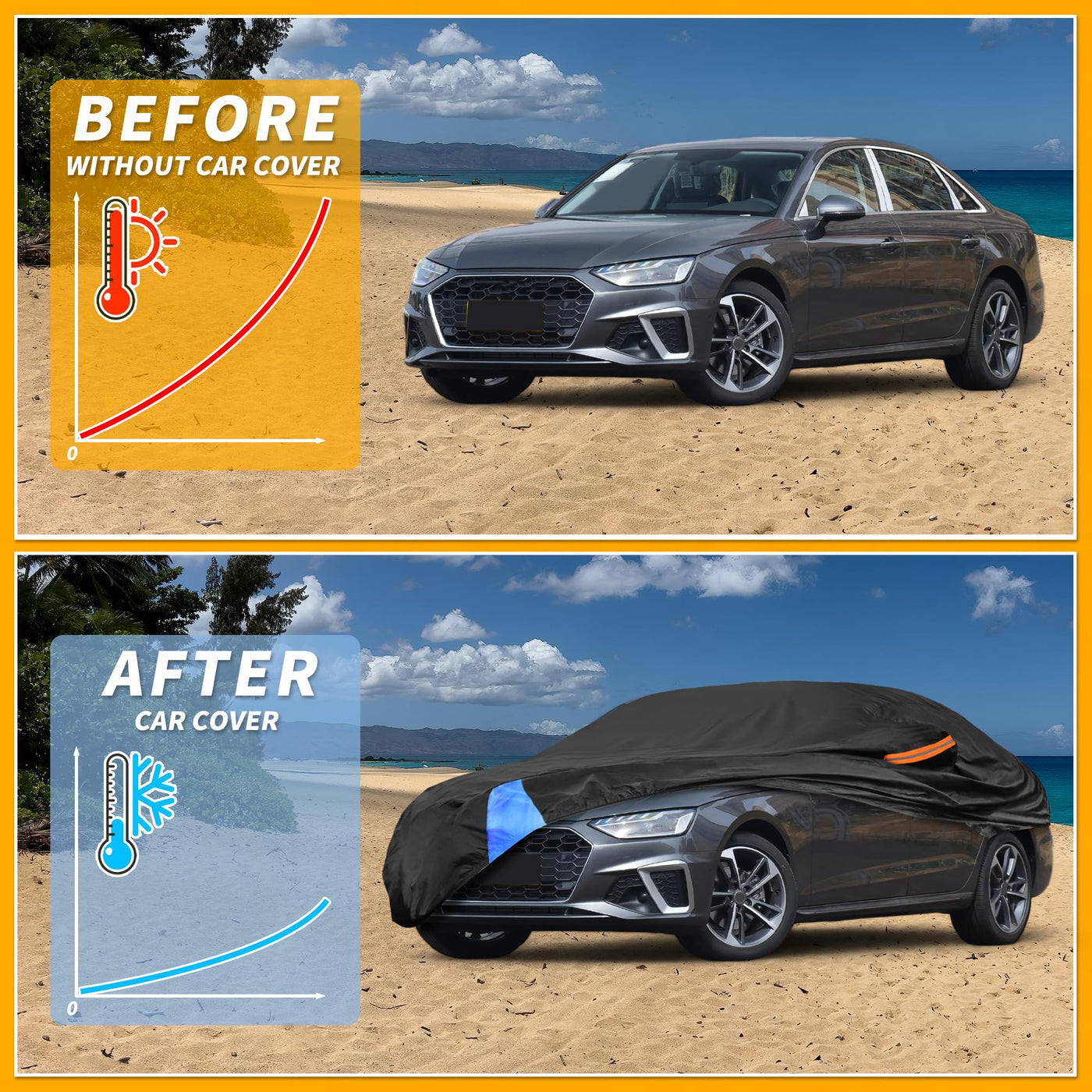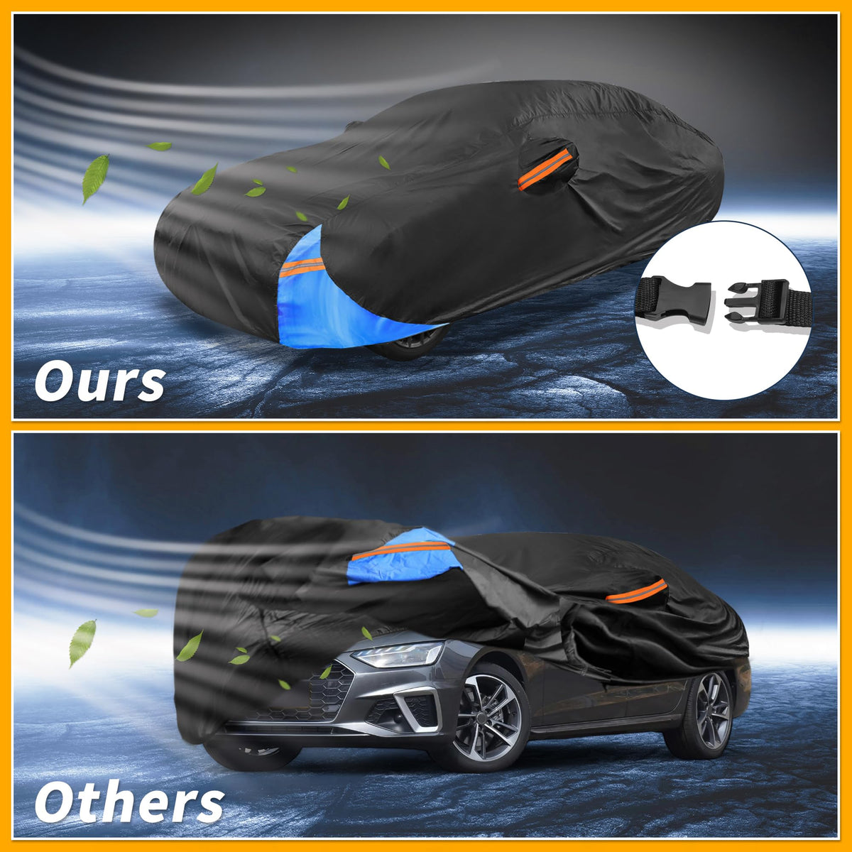 Vehicle Specific Fit:Fit for Sedan Length 177'' to 185''Product Information:Color: Black, BlueMaterial: 210D-PUDimension: 470x180x130cm / 185.04''x70.87''x51.18''(L*W*H)Product Highlights:We are focusing on the development of specific models to make them fitter and more professional car cover instead of universal car cover.The cover is breathable and allows heat, moisture, and condensation to escape.The single middle layer acts as a filter obstacle against basic everyday dust.Fully protects from any types of elements such as tree sap, dust, snow, leaves, rain and etc.It is a good replacement for the old or broken one, match for the old one.Made of:The single middle layer acts as a filter obstacle against basic everyday dust.How to use:Elastic band at the bottom of front & rear to make car cover fit your car model better.Content:1 Pc Car CoverTip:Please check the car details before your purchase. Is the car sedan hatchback or SUV?