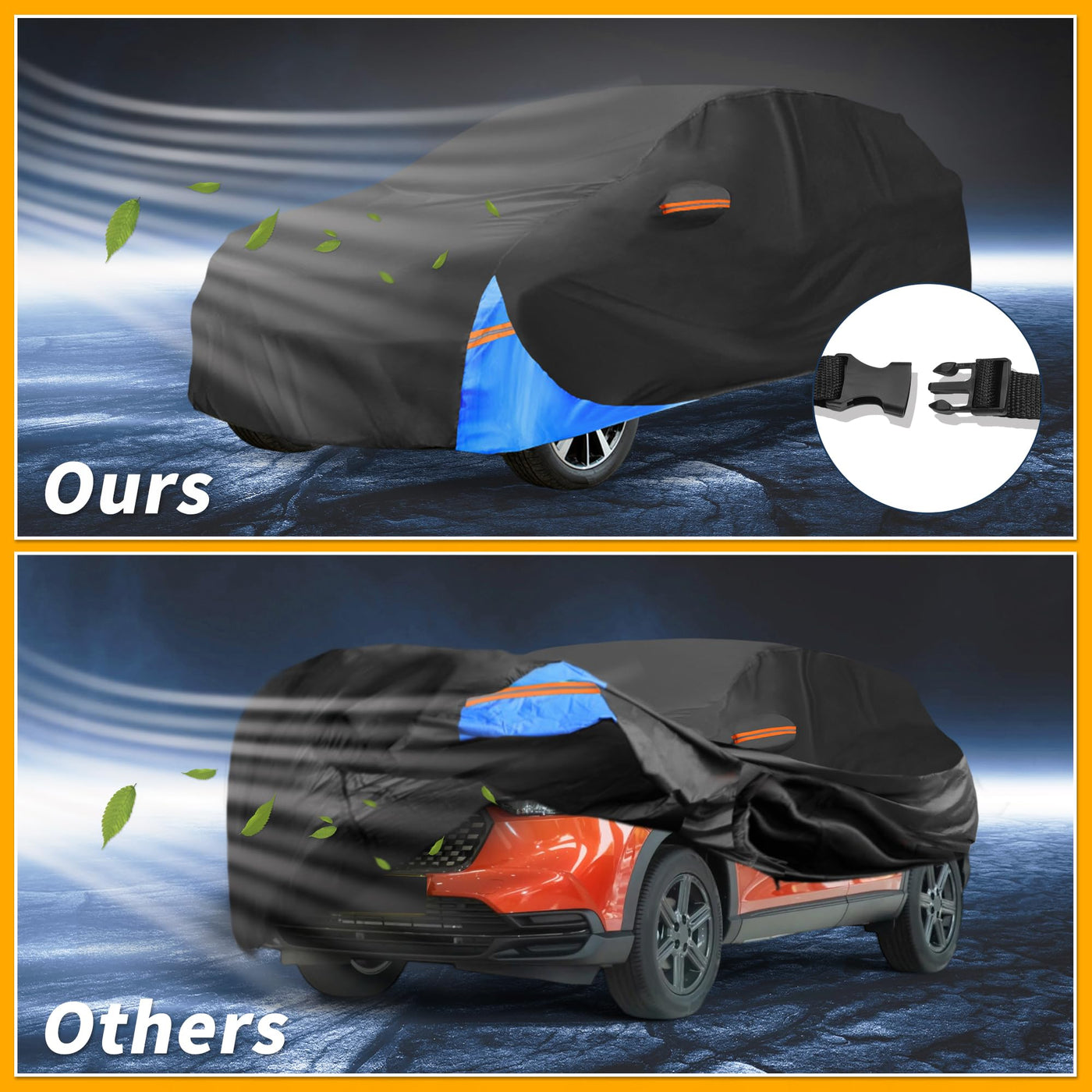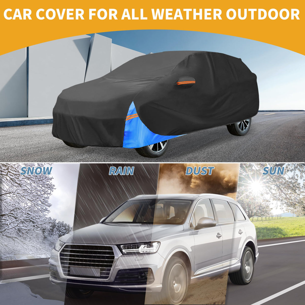 Vehicle Specific Fit:Fit for SUV Length Up to 181''Product Information:Color: Black, BlueMaterial: 210D-PUDimension: 460x185x145cm / 181.1''x72.83''x57.09''(L*W*H)Product Highlights:We are focusing on the development of specific models to make them fitter and more professional car cover instead of universal car cover.The cover is breathable and allows heat, moisture, and condensation to escape.The single middle layer acts as a filter obstacle against basic everyday dust.Fully protects from any types of elements such as tree sap, dust, snow, leaves, rain and etc.It is a good replacement for the old or broken one, match for the old one.Made of:The single middle layer acts as a filter obstacle against basic everyday dust.How to use:Elastic band at the bottom of front & rear to make car cover fit your car model better.Content:1 Pc Car CoverTip:Please check the car details before your purchase. Is the car sedan hatchback or SUV?