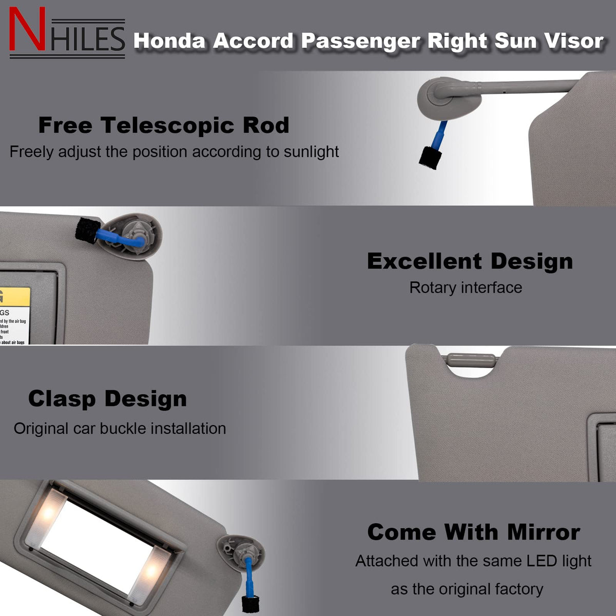 Q: What color is this sun visor?A: The sun visor is available in a sleek grey color, which complements the interior of your Honda Accord.