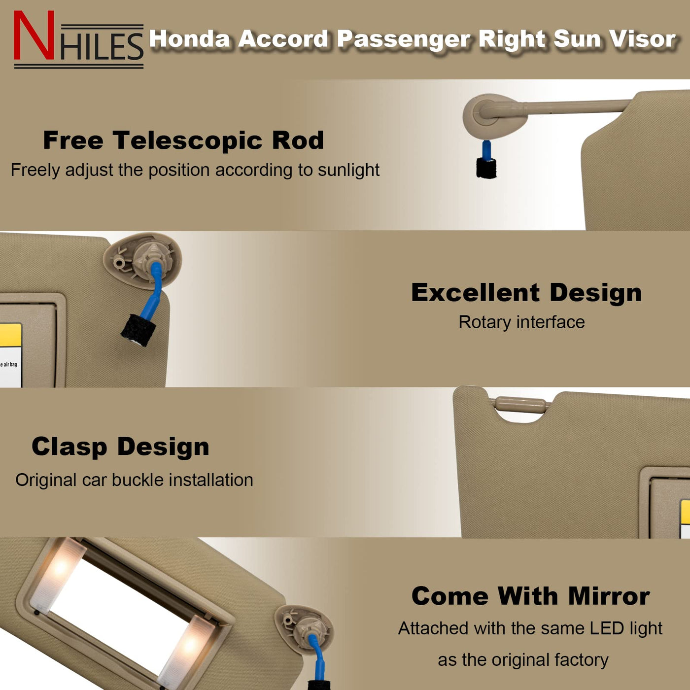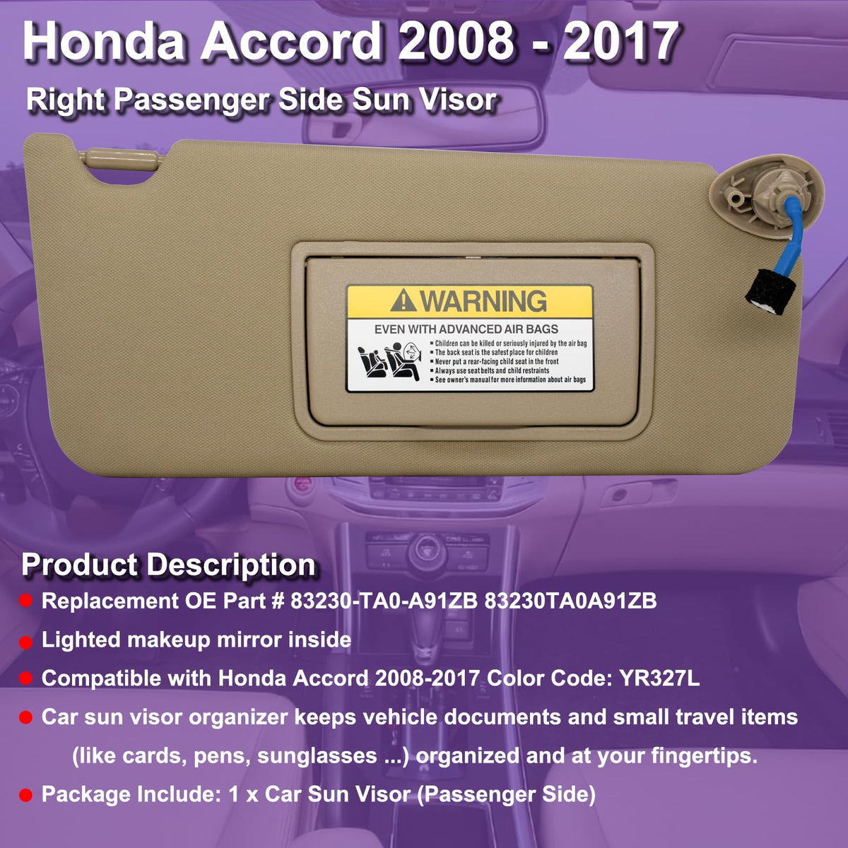 Passenger Right Sun Visor Compatible With Honda Accord 2008 2009 2010 2011 2012 2013 2014 2015 2016 With Light Oem :83230Ta0A91Zb (Beige)