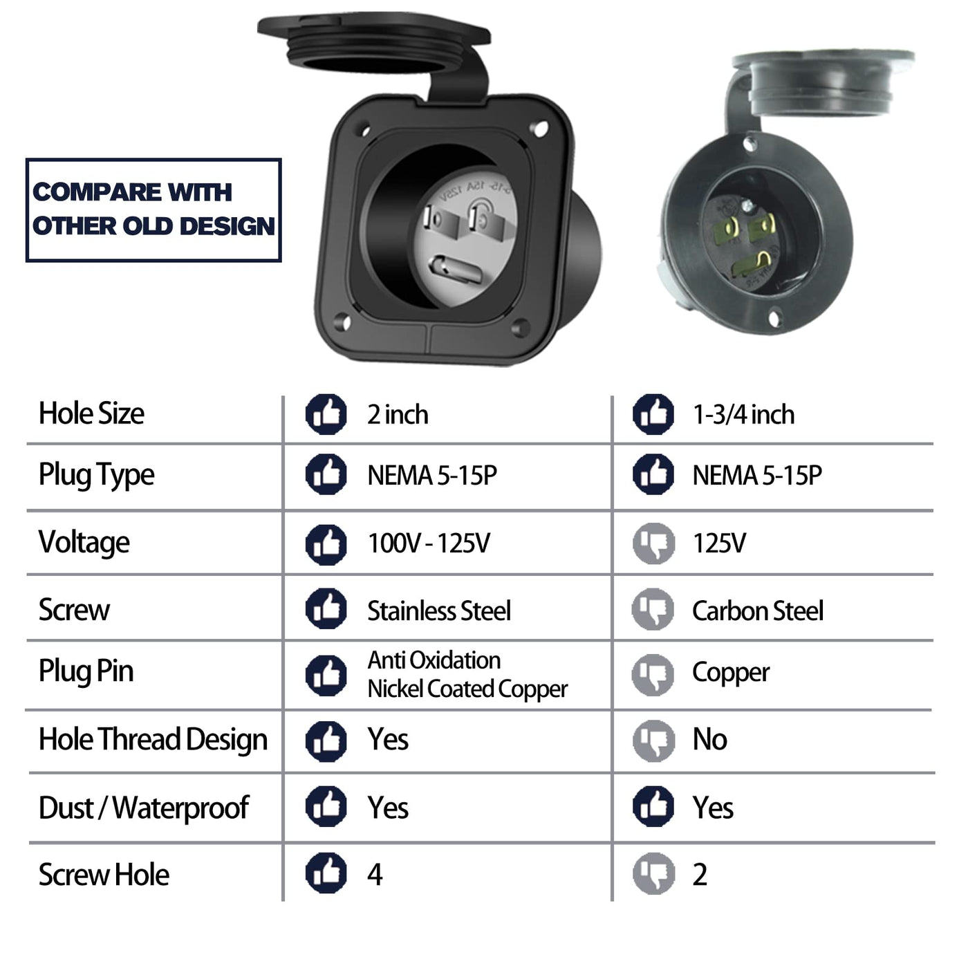 Paulinn 15 Amp Flanged Inlet 125V, Nema 5-15 Rv Shore Power Inlet Plug W/Waterproof And Back Cover, 2 Pole 3-Wire Ac Port Plug, Generator Male Receptacle For Marine Boat Rv Shed Electrical Extension