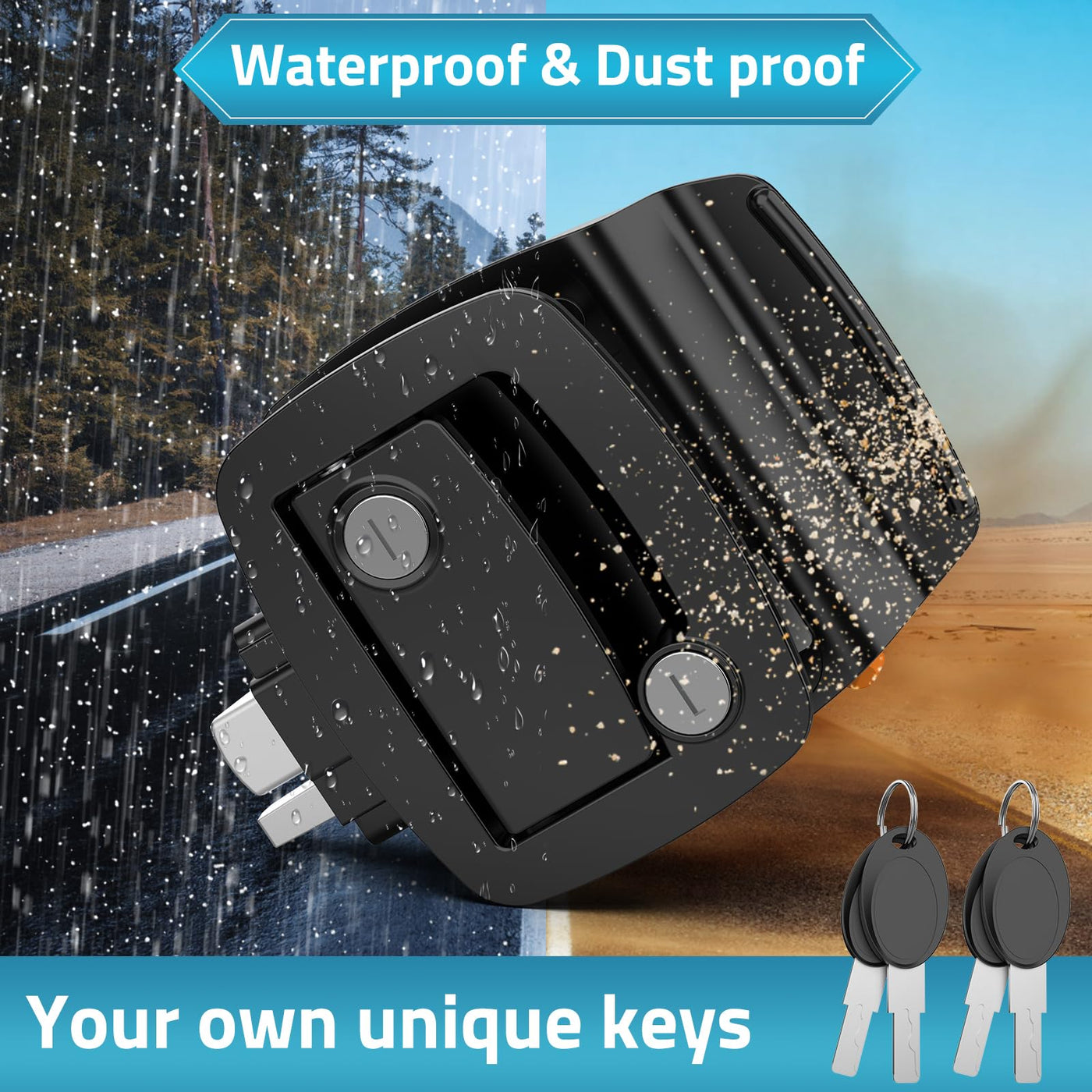 ?Aerospace-Grade Lightweight Design?The precision - machined aluminum alloy used in the PAULINN rv door lock replacement is 60% lighter. This reduction in weight lessens the stress on RV door hinges, thus ensuring long - term durability | ?Military-Grade Security?Reinforced paddle deadbolt lock resists pry attacks and forced entry. Anti-jimmy internal rotation mechanism prevents accidental lock-ins while ensuring maximum theft protection for valuables on road trips | ?Weatherproof & Corrosion-Resistant?IP67 waterproof rating and salt-spray tested metal withstand harsh conditions - perfect for coastal camping, snowbird RVing, or desert adventures. No rust, no deformation, just year-round reliability | ?Your Only Key?Each key you receive is designed only for this rv lock, assuring that there are no other duplicate keys! Higher level security. Just travel worry free | ?Universal Fit & Easy Installation?Hole cutouts: from 2 1/2 x 3 1/2 to 3 x 4 inches. Door thickness: from 1 1/4 to 1