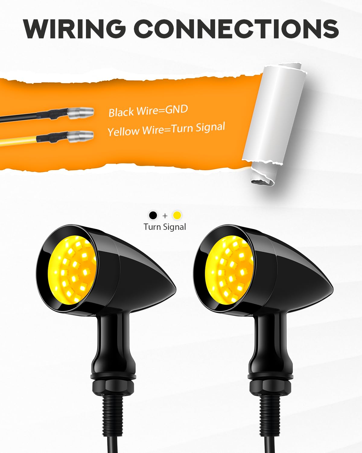 Q: What wire configuration is needed for installation?A: The PBYMT Motorcycle Bullet Turn Signal Lights come with a 4-wire setup: black for ground, red for brake lights, white for running lights, and yellow for turn signals. Depending on your motorcycle's specific circuit, you can select three of the four wires to switch to a 3-wire mode for installation.