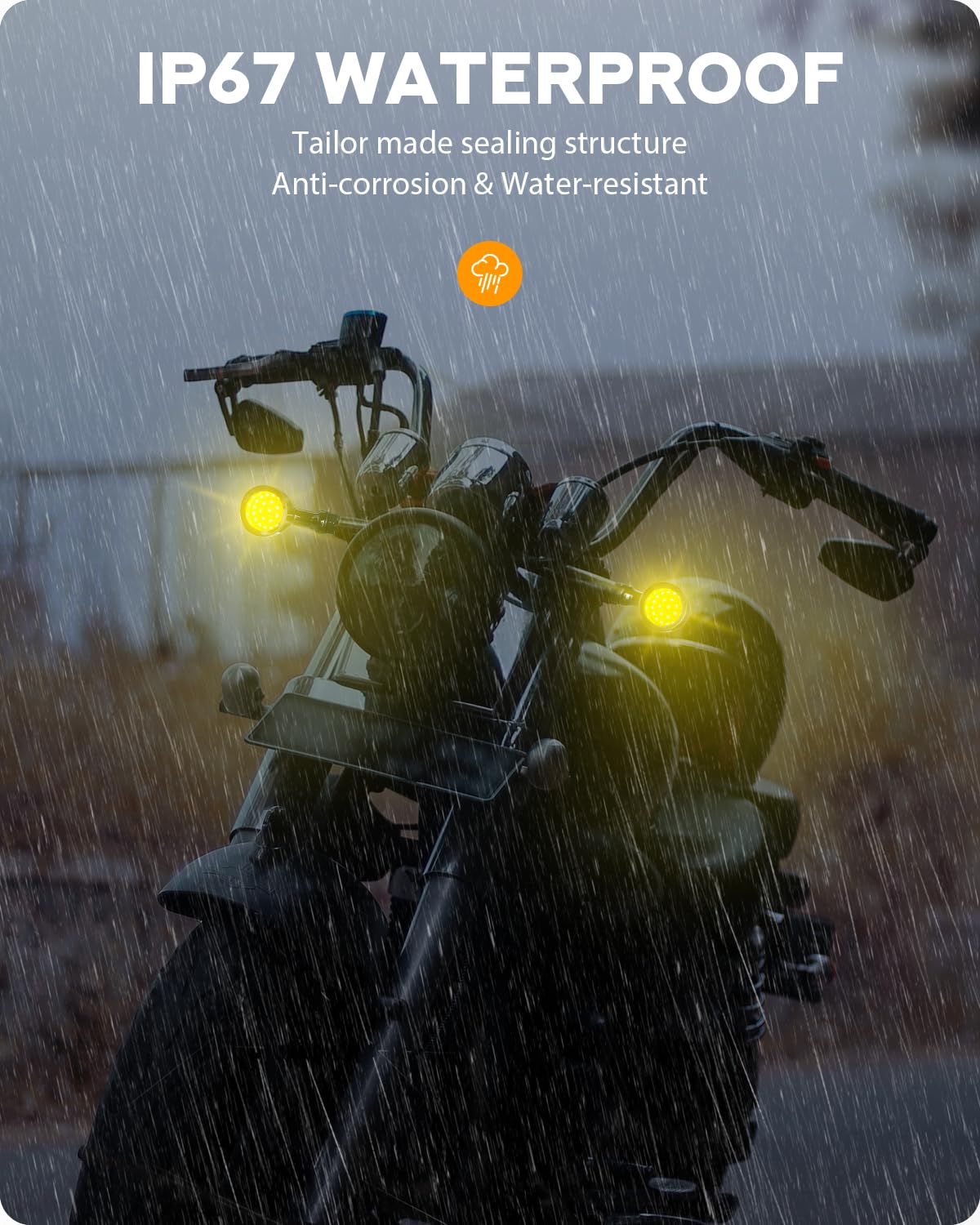 Q: Are these turn signal lights waterproof?A: Yes, the PBYMT LED turn signal lights are rated IP67 waterproof, making them resistant to harsh weather conditions such as rain and fog. They are designed to withstand extreme environments, ensuring reliable performance regardless of the weather.