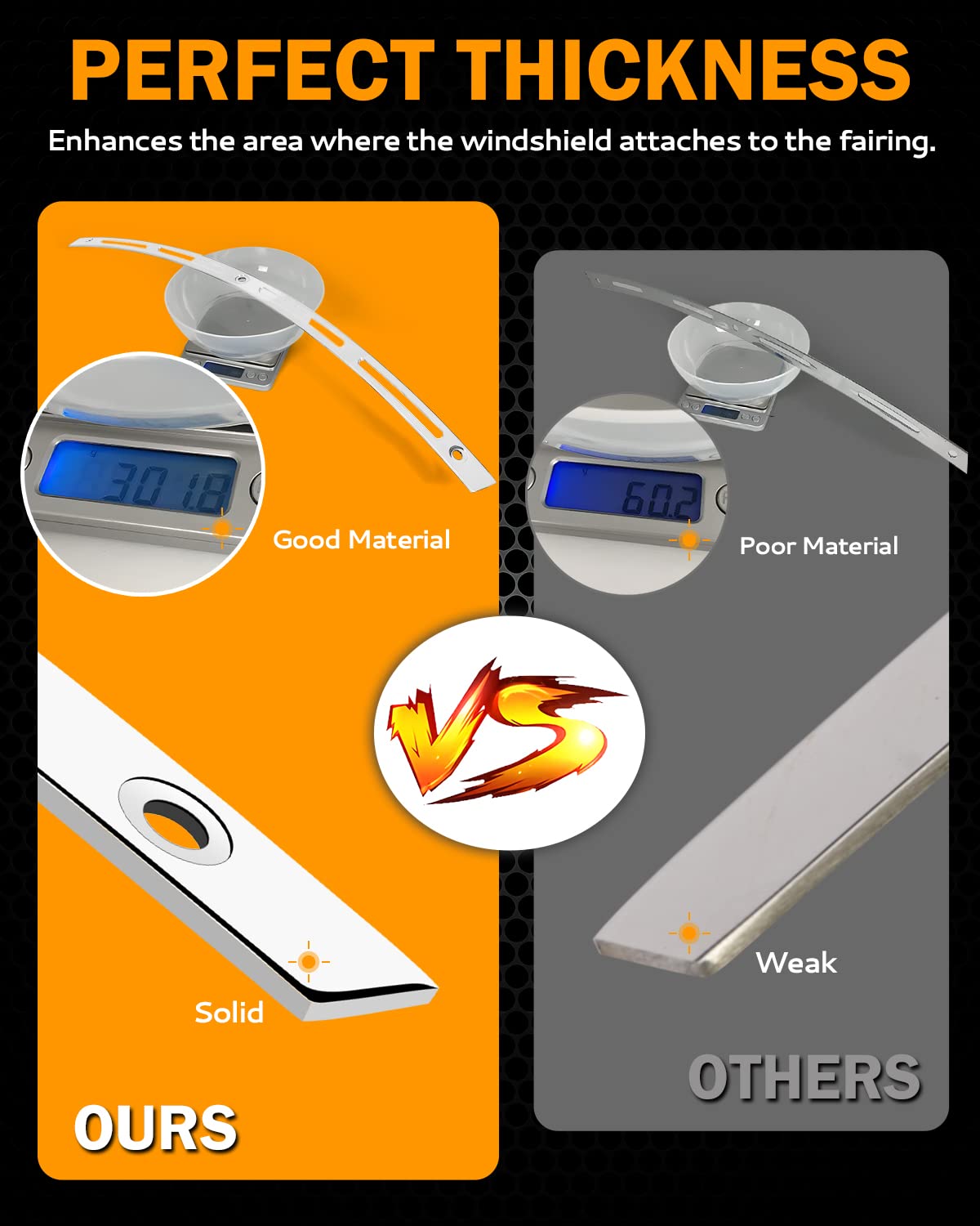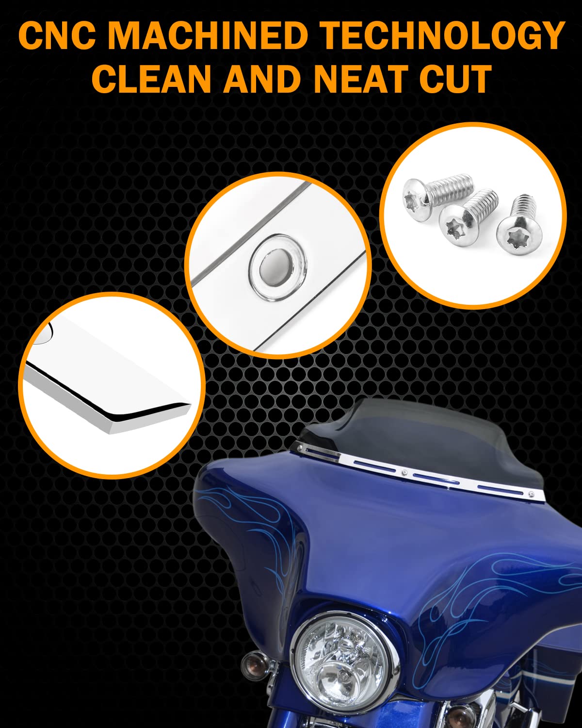 Q: What material is the windshield trim made of?A: The windshield trim is made of high-quality polished stainless steel, ensuring durability and a sleek appearance that enhances the look of your motorcycle.