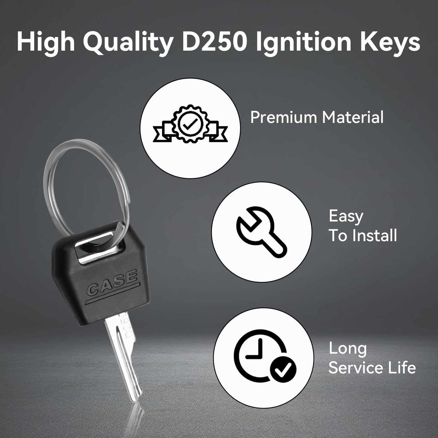 - Q: What equipment is compatible with the D250 Ignition Keys? A: The D250 Ignition Keys are compatible with a variety of heavy equipment models including Case Skid Steer models like 760, 921, and 1845C, as well as Case International Tractor models such as 580D, 580K, and 821B. They also fit several Case IH Loader Models and numerous other tractor models. Always check the compatibility with your specific equipment before purchasing.
