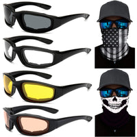 6 Packs Motorcycle Gear Set - 4 Packs Dirt Bike Motorcycle Motocross Goggles With 1 Pack Skeleton Face Mask And 1 Pack Usa Flag Snowboard Face Mask. Great Motorcycle Accessories For Men And Women, Using Them On The Motorcycle, Dirt Bike, Snow, Riding, Cycling, Mountain Bike, Running, Climbing, Fishing, Skydiving, Offroad, Outdoors And Sports, Snowmobile, Motocross, Snowboarding, Skating, Etc. It Is Suitable For Outdoor, Night Travel, Cloudy, Rainy, Foggy, And Snowy Days. | Reducing Light Lens - Peicees Motorcycle Safety Glasses For Men, Women Use High-Definition Lenses To Provide You With A Natural And Clear Vision. It Not Only Weakens The Bright Lights And The Sun But Also Protects Your Eyes From The Elements Of The Harsh Environment. Bicycle Sunglasses Have A Protective Coating, Which Can Block The Harmful Sun. These Motorcycle Glasses For Men Women Allow You To Eliminate Reflected Light And Scattered Light, Effectively Prevent Sunburn And Protect Eye Health. | Windproof, Dustproof, And Fog Proof - There Is A Layer Of Comfortable Sponge Inside The Motorcycle Goggle, Which Can Effectively Block Wind And Dust, And Will Not Harm Your Eyes. These Motorcycle Glasses Can Also Effectively Prevent Objects From Flying Into The Eyes. There Is An Anti-Fog Airbag Inside The Bike Glasses, Which Allows You To Travel In The Snow Without Worrying About This Problem. | Impact And Scratch Resistant - The Lens Of The Bicycle Sunglasses For Men And Women Is Made Of Shatterproof Polycarbonate. Once You Encounter A Strong Impact, There Will Be No Rupture Problem, And Your Eyes Can Be Well Protected From Damage. Riding Glasses Have Excellent Scratch Resistance While Remaining Lightweight And Comfortable For Long-Term Riding. The Package Has 4 Color Lens Mixed, Including The Gray, Clear, Yellow, Pink Lens And 2 Packs Of The Skull And American Flag Face Masks. | Comfortable Glasses And Face Masks - The Inside Of The Padding Motorcycle Goggles Are Covered With High-Quality Foam. The Comfortable And Durable Temples Are Friendly To The Skin And Make Your Wear More Comfortable. High-Quality Temple Folds Are Smooth And Durable. And The Balaclava Is Made Of High-Quality Materials And Excellent Elasticity. You Can Use It As A Sports Wrist, Wear Creative Headscarves, Dust Masks, Hair Bands, Neckbands, Masks, Hats, Etc.