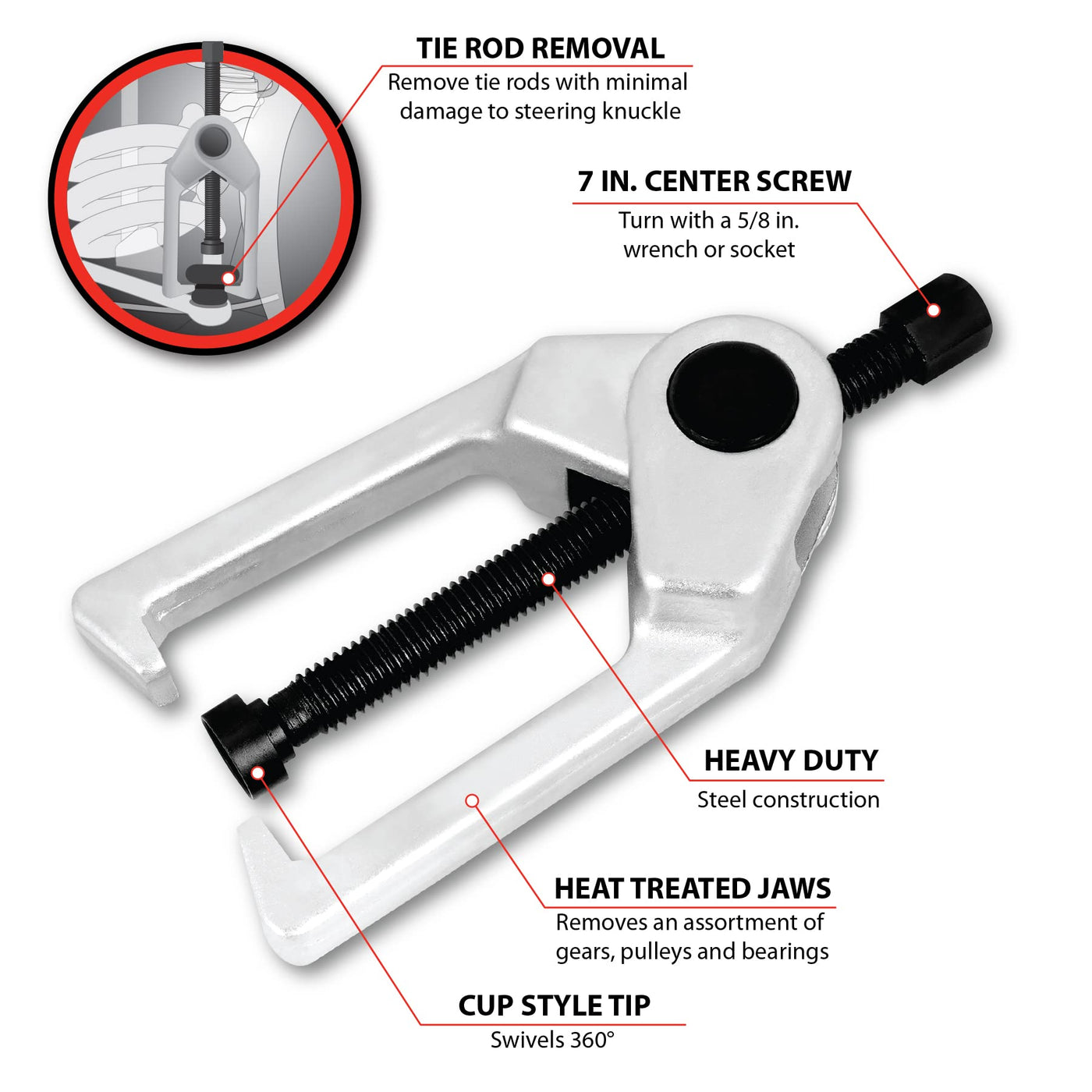 Performance Tool W83021 Tie Rod Puller For Pulling Worn Tie Rod Ends On Most Front Wheel Drive And Rear Wheel Drive Autos, Heavy Duty Steel Construction And Heat Treated Jaws, Removes An Assortment Of Gears Pulleys And Bearings, Designed To Remove Tie Rods With Minimal Damage To Steering Knuckle.