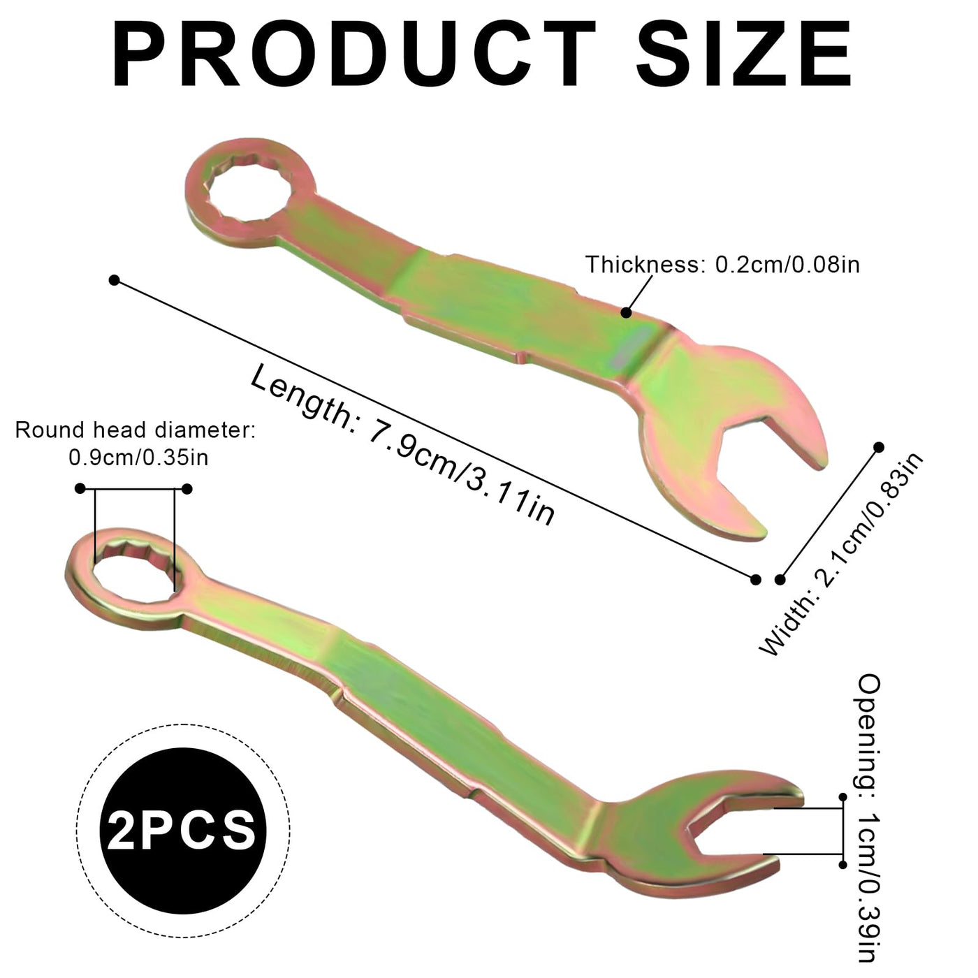 Q: What are the dimensions of the PEUTIER adjustment wrench?A: The wrench measures 7.9x2.1cm (3.11x0.83 inches) with a thickness of 0.2cm (0.08 inches), an opening size of 1cm (0.39 inches), and a round head diameter of 0.9cm (0.35 inches), making it portable and easy to store.