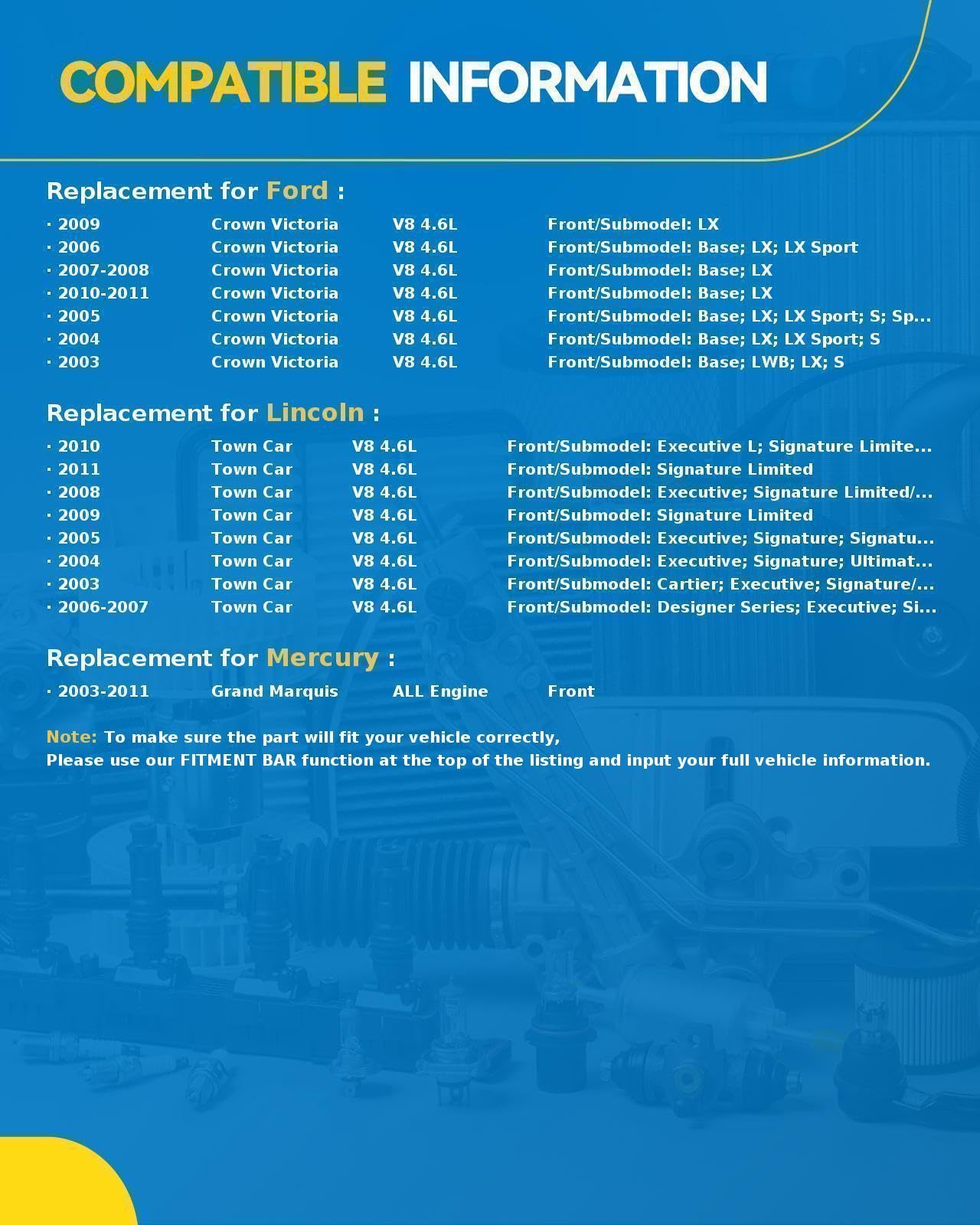 Struts Fitment: PHILTOP Complete Struts Replacement for 2003-2011 Mercury Grand Marquis 2003-2011 Lincoln Town Car 2003-2011 Ford Crown Victoria. Please Comfirm our products are compatible with your car. Manufacturer Part Number: 171346*2 | Improved Handling: Shock struts help improve the handling of a vehicle by providing better stability and reducing body roll. This can make the vehicle more responsive and easier to control, especially during sudden maneuvers or when driving on uneven terrain. | OE-Quality, Vehicle-Specific Design: Application specific coil spring, mount and strut feature an OE-style design to ensure an optimized ride and handling experience unique to each vehicle profile. | Recovery Performance Of 100%: Struts that are worn out add 20% to halting distance. After changing the PHILTOP struts component, reduce the stopping distance and increase the safety distance. Boost your driving confidence while reducing halting distance and increasing steering speed. | Increased Safety: Shock struts help improve safety by providing better traction and reducing the risk of skidding or losing control during sudden braking or acceleration. They also help reduce the wear and tear on other suspension components, which can lead to a safer and more reliable vehicle overall.