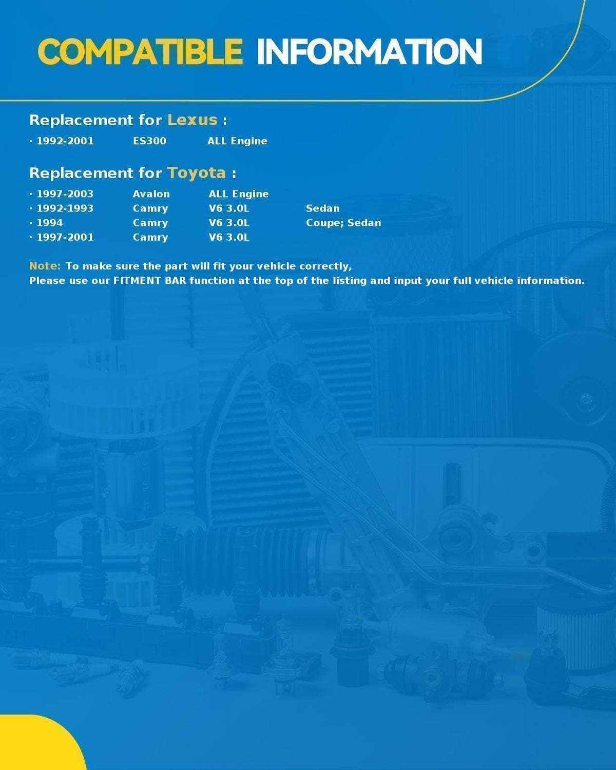?Vehicle Fitment? Direct replacement for 1992 1993 1994 1997 1998 1999 2000 2001 Toyota Camry ,for 1997 1998 1999 2000 2001 2002 2003 Toyota Avalon ,for 1992 1993 1994 1995 1996 1997 1998 1999 2000 2001 Lexus ES300 | ?Durable Material?Higher chromium plating, high smoothness, and resistance to surface corrosion make oil seals difficult to wear. | ?Function?Easy installation will increase steering responsiveness, minimize body lean, and improve the ride with an upgraded brake system. | ?Installation?Professional installation is strongly advised. A spring compressor is not necessary. | ?Notice?Enter the ''Year + Make + Model '' in the ''Amazon Confirmed fit ''