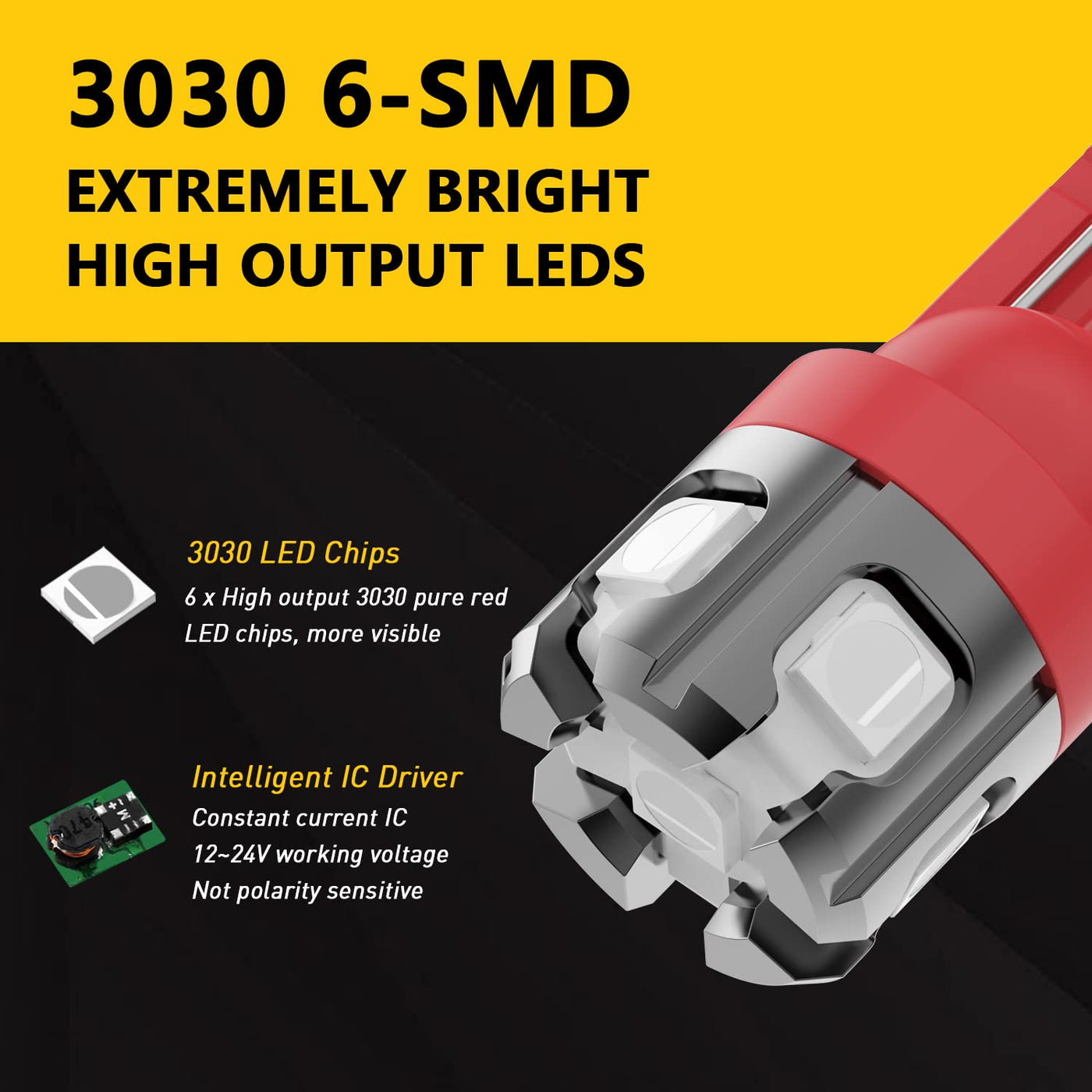 Phinlion 194 Led Light Bulb Red Super Bright 168 2825 W5W T10 Wedge 6-Smd 3030 Chipsets Led Replacement Bulbs For Car Dome Map P