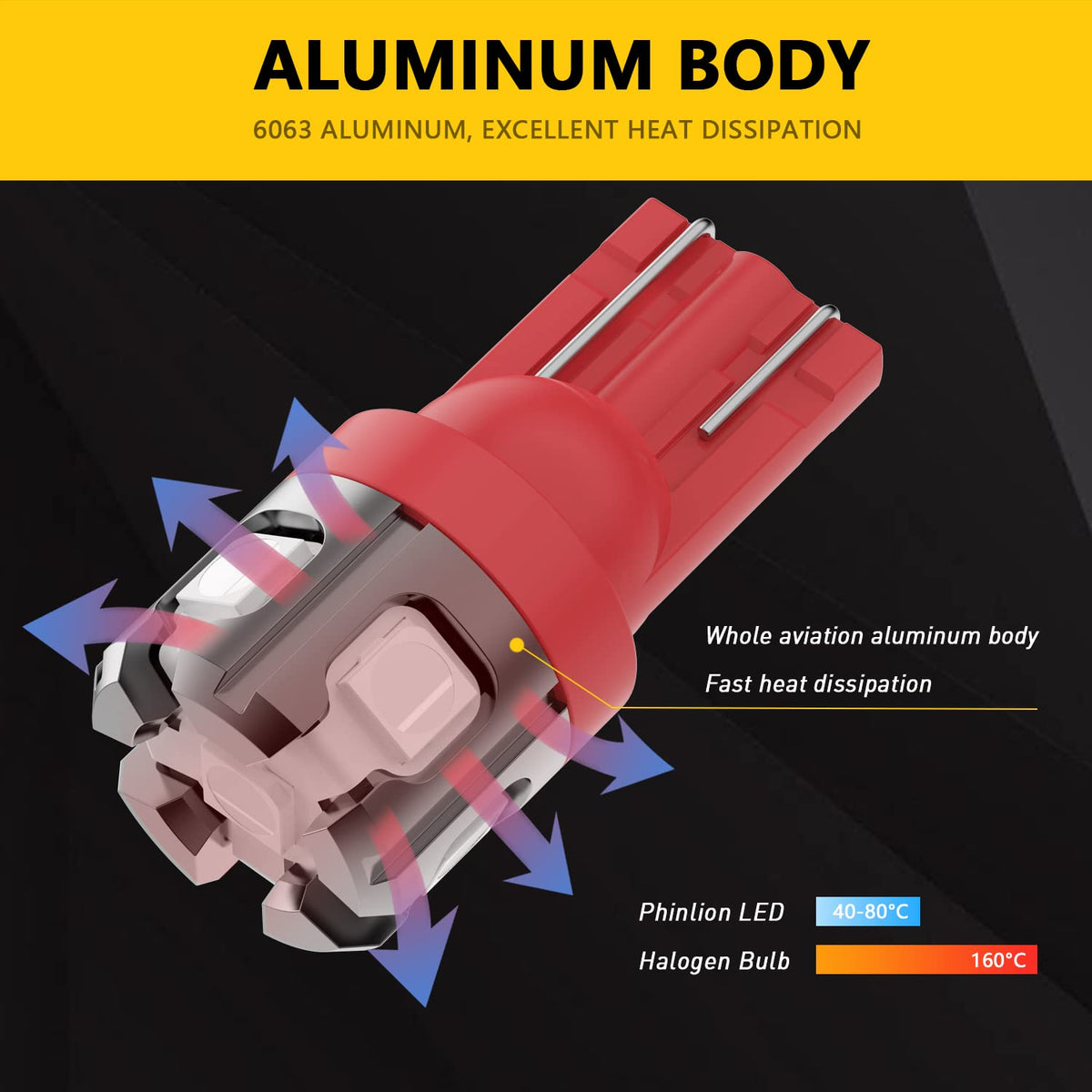 Q: How does the aluminum body of the Phinlion 194 LED Light Bulb benefit its performance?A: The whole aluminum body of the Phinlion 194 LED Light Bulb enhances heat dissipation, which is crucial for maintaining optimal operating temperatures and extending the bulb's lifespan. This design helps prevent overheating, thereby ensuring reliable performance over time.