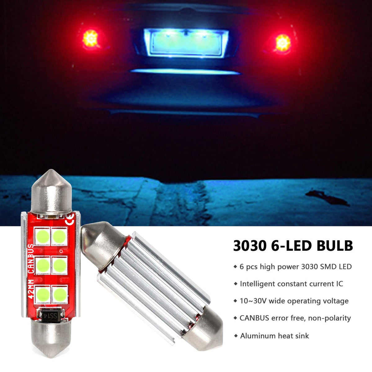 Specifications:Led Chip: 3030 Smdvoltage: 1030V(Fits 12V24V Vehicles)Color: Ice Bluelumens: 500Lmfeatures:500 Lumens Super Brightnon-Polarity Design, Easy To Install Plug And Playbuilt-In Constant Current Ic, Wide Working Voltagebuilt-In Canbus System, Error Free For Most Vehiclesaluminum Heat Sink For Better Heat Dissipation, Longer Lifespanplease Note:1)This Bulb Is Canbus Error Free For Most Vehicles But The Error Free Capability May Limited To Few Newest Vehicles Especially The Newest European Vehicle2)Amazon Fitment System May Not Be 100% Accurate, Please Check The Owners Manual And Confirm The Size Is Correct For Your Vehicle Before Purchasing