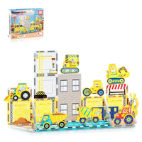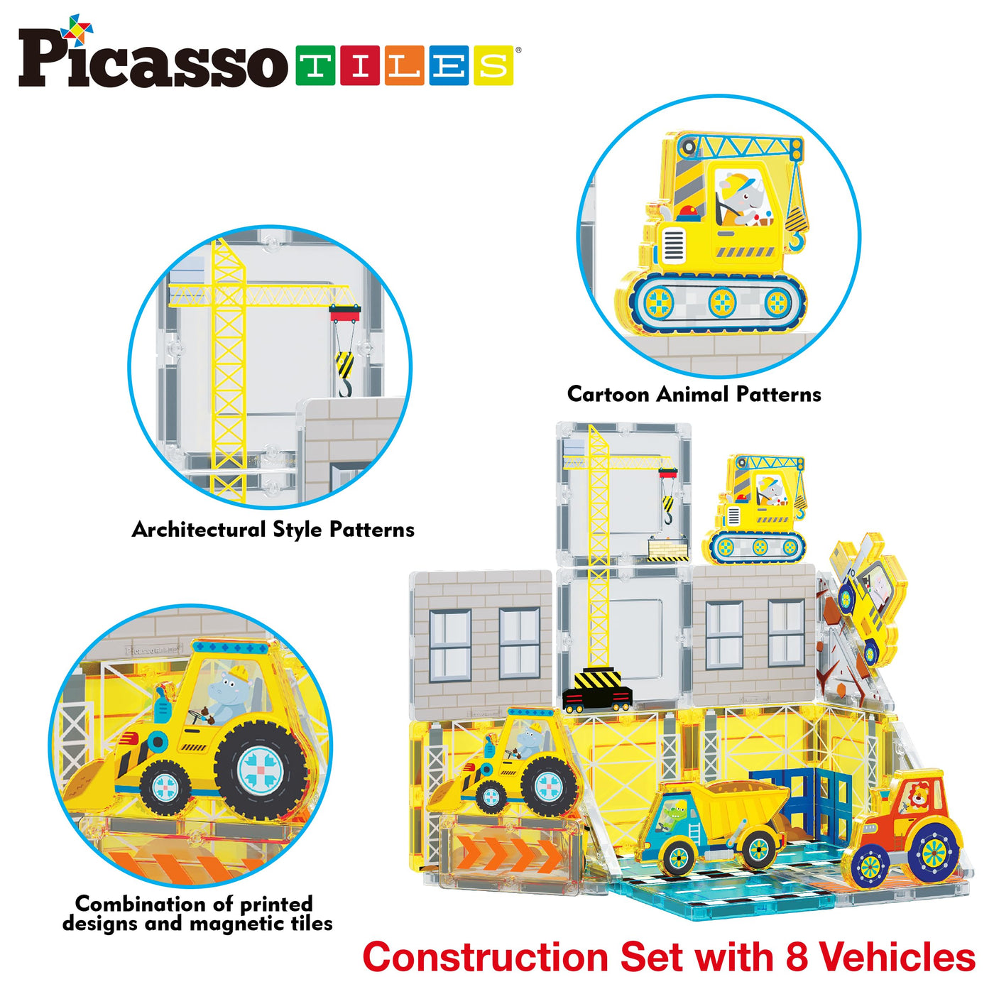 PicassoTiles Magnet Tile Building Blocks Printed Construction Themed Toy Set with 8 Character Action Figure Vehicles Magnetic Tiles STEM Brain Development Learning Toys for Toddlers Kids Ages 3+ PTQ21