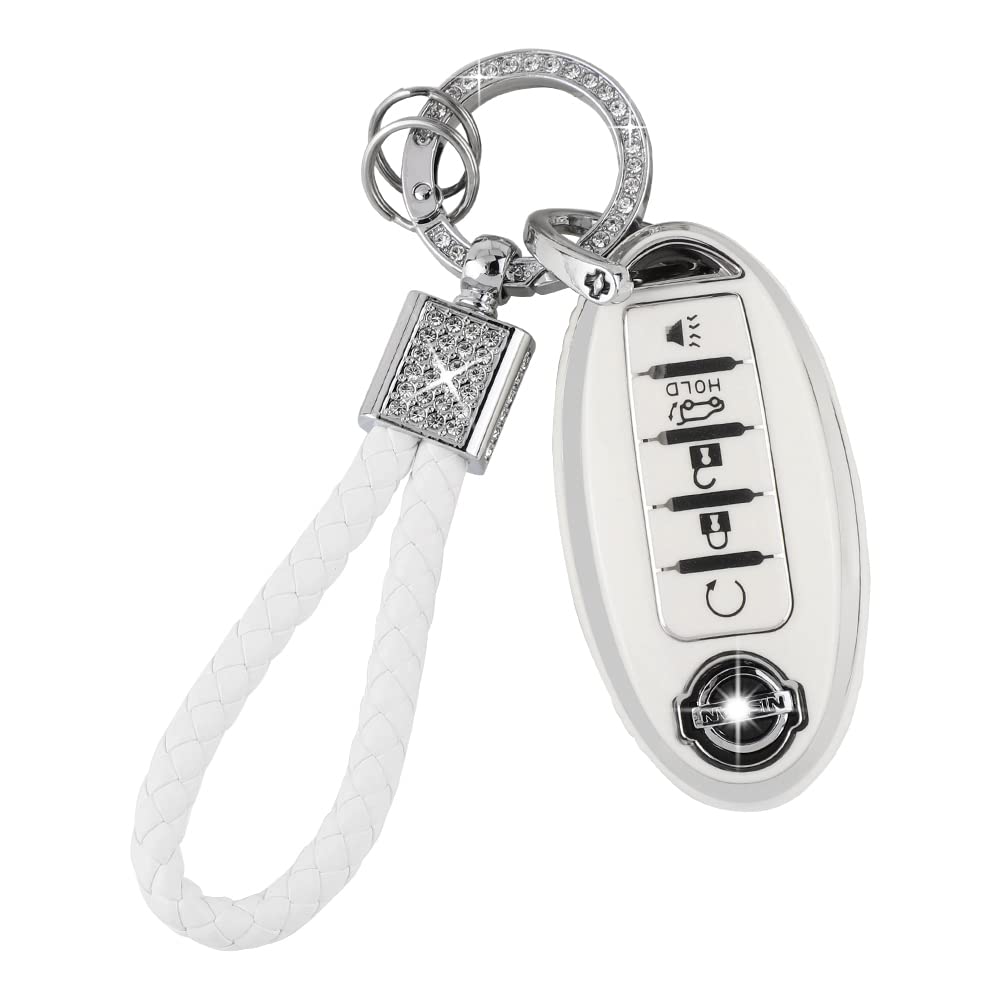 Pifoog Car Key Cover For Nissan 5 Buttons Keys Fob Case Tpu Bling Keychain For Nissan Altima Sentra Rogue Pathfinder Murano Armada Maxima Versa Girly Women White Silver