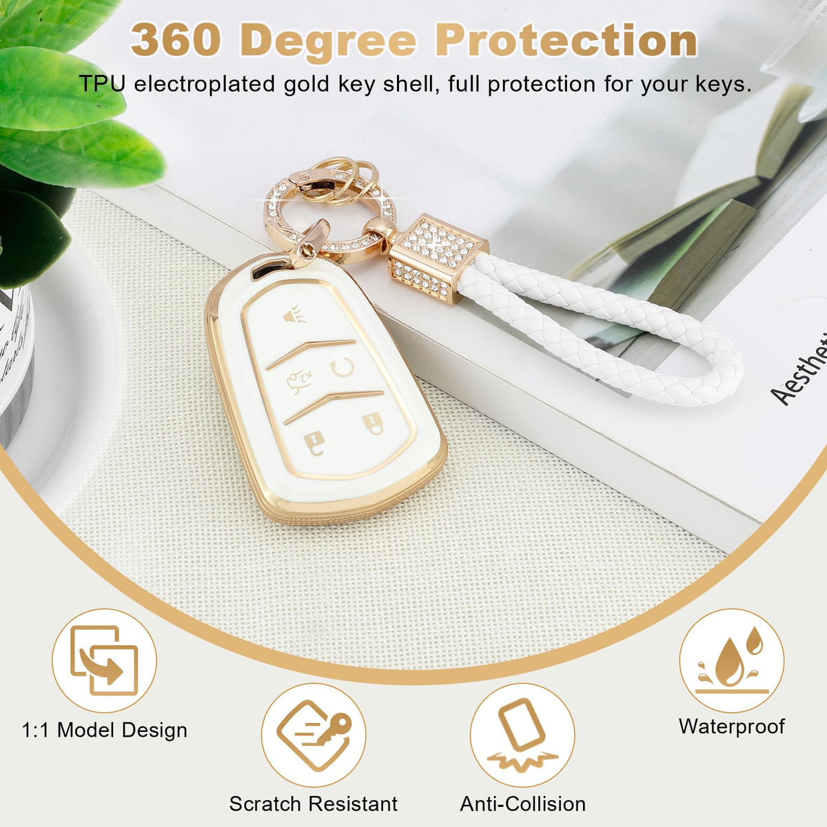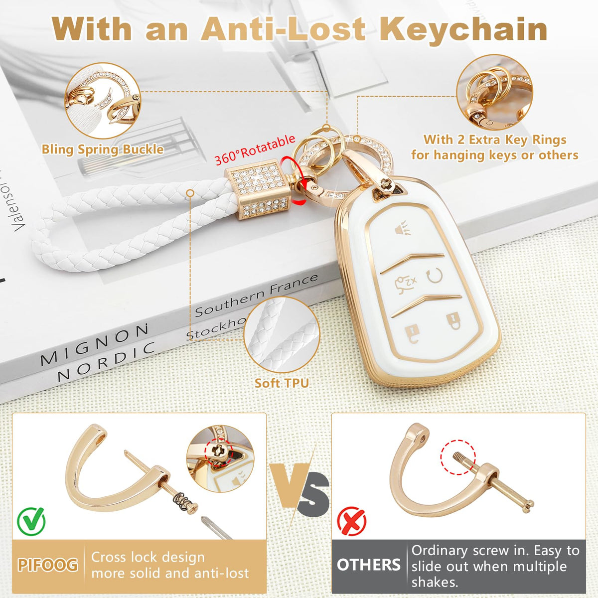 Pifoog Key Fob Cover Fit For Cadillac Xt5 Xt6 Xt4 Cts Ct6 Ats Srx Xts 5 Buttons White Gold Car Keys Case Shell Bling Keychain Fu