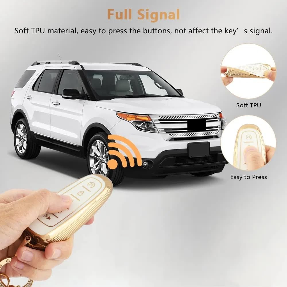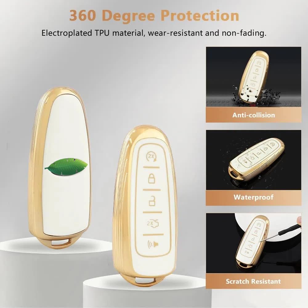 Specification Name: Premium Key Fob Cover for Ford 5-button Material: Premium TPU and Crystal Color: White and Big Gold Edge Design Kindly Note: The applicable car models years given are for reference only. Please confirm your keys shape same as pictured before purchasing. Pls refer to picture 6th. Fitment For Ford Edge Limited 2011 2012 2013 2014 For Ford Edge Sport 2013 2014 For Ford Expedition 2017 For Ford C-Max Titanium Hybrid 2017 For Ford Explorer Limited/Sport 2011 2012 2013 2014 2015 For Ford Focus Titanium 2013 2014 2015 2016 2017 2018 For Ford Taurus 2013 2014 2015 2016 2017 2018 2019 For Ford Escape 2013 2014 2015 2016 2017 2018 2019 For Lincoln MKS 2013 2014 2015 2016 For Lincoln MKT 2015 For Lincoln MKX 2013 2014 2015 For Lincoln Navigator 2016 2017 Package Lists 1PC Car Key Fob Case for Ford 1PC Glittering Car Key Chain for Ford 1PC Screwdriver (Keep it with you so you can take out the keys at any time.) If there is any problem with the product or dissatisfaction when receiving the goods. Please contact us through Amazon, PIFOOG will reply you within 24 hours. Hope you get more surprise from PIFOOG's product!