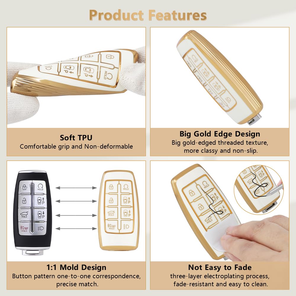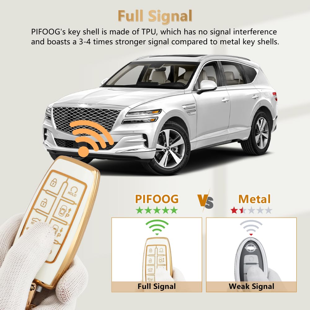 Specification Name: Premium 8 Buttons Key Fob Cover for Genesis GV70 GV80 Material: TPU and Crystal Color: White and Big Gold Edge Features: Snug fit, Not easy to fade, Anti-lost Design, Full Signal, Full Protection, Cute and Stylish, Anti-Scratch and Waterproof etc. Applicable Models (ONLY for 8 Buttons) For Genesis GV70 2022 2023 For Gnesis GV80 2021 2022 2023 NOTE: It is applicable if your car key shape and button pattern are same as the picture. Package Lists 1PC Car Key Shell for Genesis GV80 GV70 1PC Car Keychain for Genesis GV70 GV80 1PC Screwdriver (Pls keep it with you so you can take out the keys at any time.) If you have any question, please tell PIFOOG through Amazon order. Kindly Note ? Due to shooting conditions and angles, there may be slight color variations between the actual product and the images. ? The applicable car models years given are for reference only. Pls confirm your keys shape and buttons patterns same as pictured before buying. ? To better protect the key, PIFOOG chooses a slightly thick material. Pls use a little force when pressing the button. ? The car keys in the picture are not included in the package. Hope you get more surprise from PIFOOG's product!
