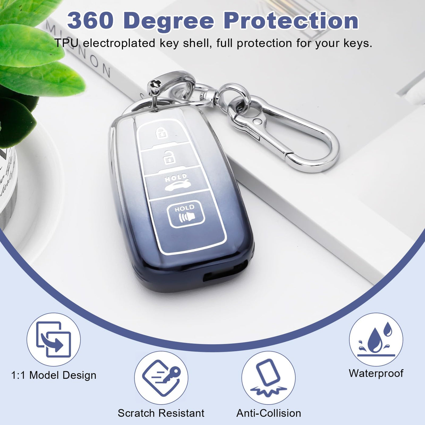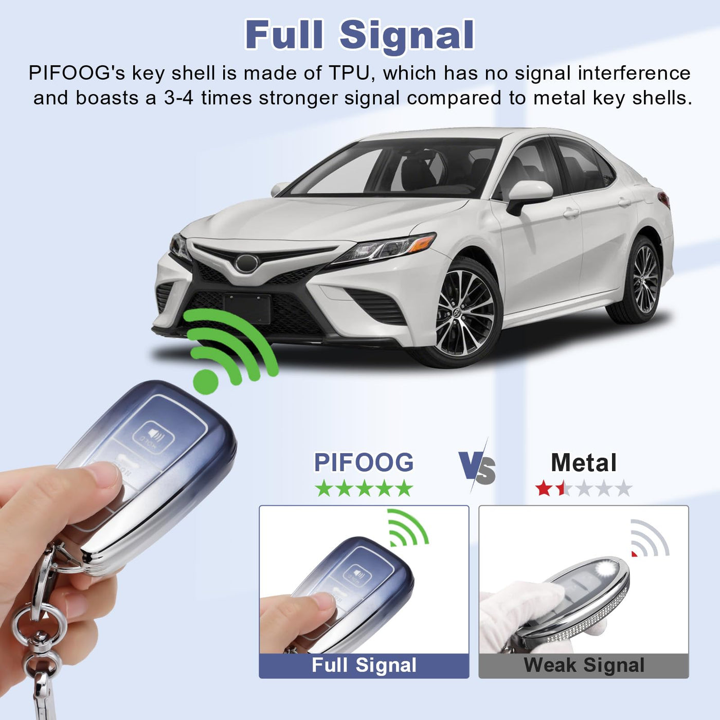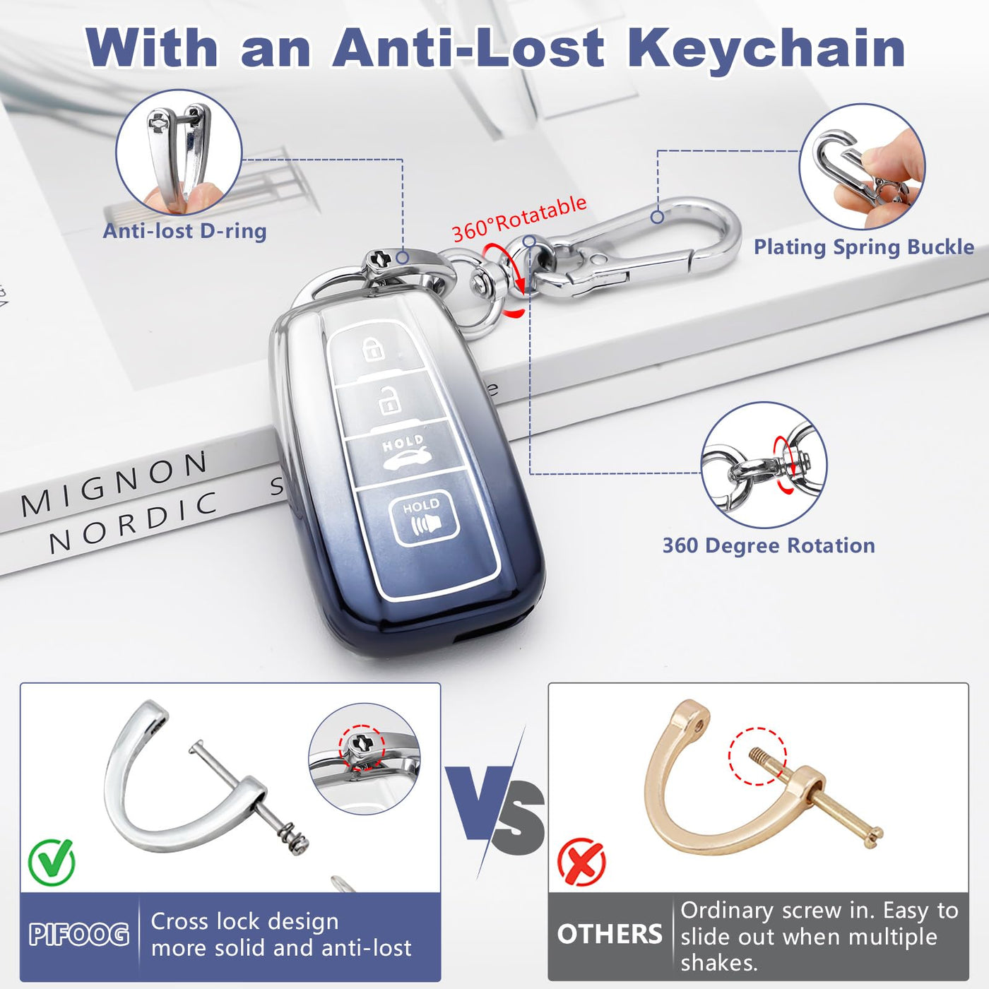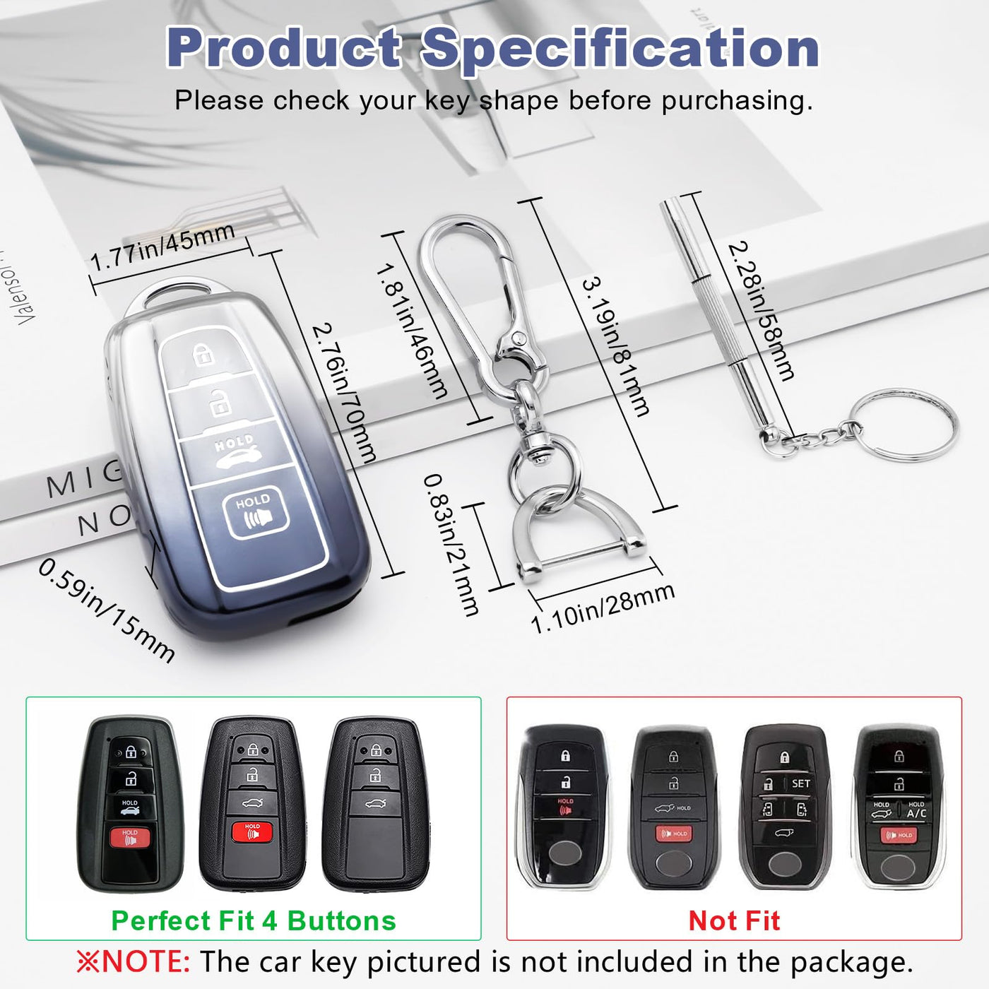 Specification Name: 4 Buttons Car Key Fob Cover for Toyota Material: TPU Color: Gradient Navy Blue Features: Snug fit, Not easy to fade, Anti-lost Design, Full Signal, Full Protection, Cute and Stylish, Anti-Scratch etc. Compatible Models (ONLY for 4 Buttons) For Toyota Highlander 2020 2021 2022 2023 For Toyota Highlander Hybrid 2020 2021 2022 2023 For Toyota Camry 2018 2019 2020 2021 2022 2023 2024 (Not Fit Camry LE) For Toyota Camry Hybrid 2019 2020 2021 2022 2023 2024 For Toyota Corolla SE 2020 2021 2022 2023 For Toyota Corolla XSE 2020 2021 2022 For Toyota Corolla Hybrid LE 2020 2021 2022 For Toyota Corolla Hatchback 2019 2020 2021 2022 For Toyota GR Corolla premium 2024 For Toyota RAV4 2019 2020 2021 2022 2023 2024 (Not Fit RAV4 LE) 2019 2020 2021 2022 2023 2024 (Not Fit RAV4 LE) For Toyota 4Runner 2022 2023 2024 For Toyota Avalon Hybrid 2019 2020 2021 2022 For Toyota Avalon 2019 2020 2021 2022 For Toyota Prius 2019 2020 2021 2022 For Toyota Prius Prime Hybrid 2019 2020 2021 2022 For Toyota C-HR 2018 2019 2020 2021 NOTE: The car model is for reference. Pls confirm your car key shape and button patterns same as pictured before buying. Package Lists 1PC 4- Button Key Fob Protector Case for Toyota 1PC Silver Car Key Chain for Toyota 1PC Mini Screwdriver (Pls keep it with you so you can take out the keys at any time.) If you have any question about the key holder covers for Toyota, please tell PIFOOG through Amazon for support. Kindly Note 1. Due to shooting conditions and angles, there may be slight color variations between the actual product and the images. 2. There may be marks inside the key fob cover. This is normal during the plating process and is not a quality issue.