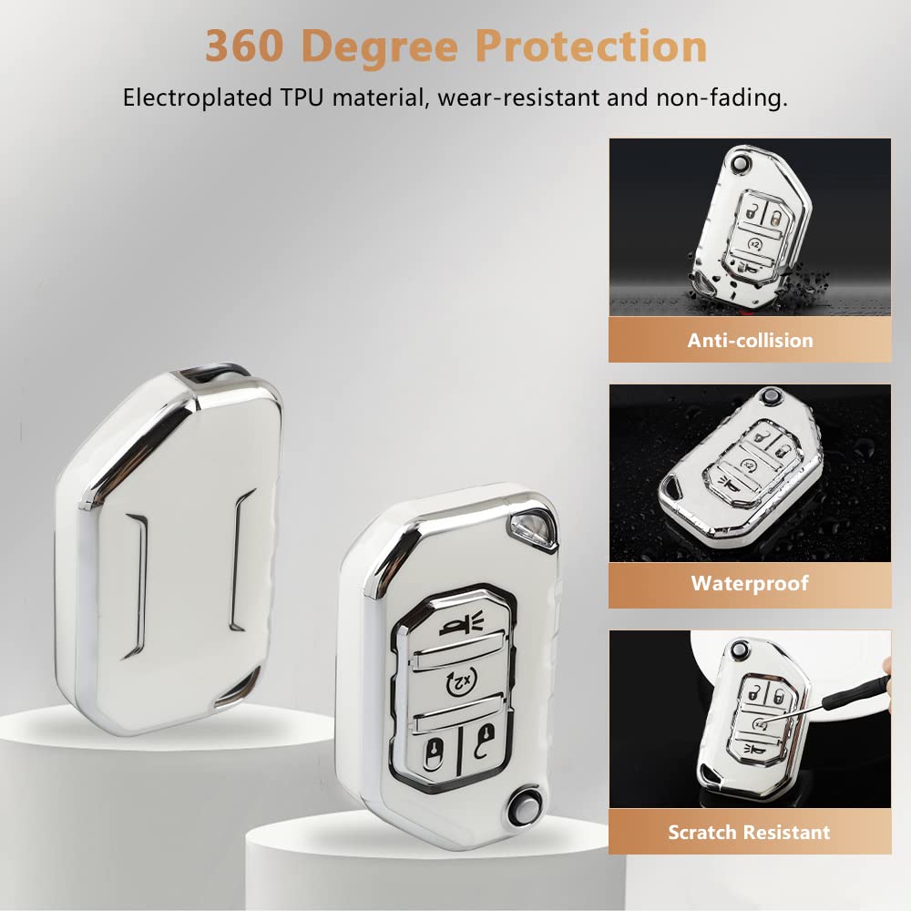 Specification Name: Premium TPU Key Fob Cover for Jeep Wrangler and Gladiator Material: Premium TPU and Crystal Color: White and Silver Kindly Note A. The applicable car models years given are for reference only. Please confirm your keys shape same as pictured before purchasing. B. To protect the key better, we have chosen a slightly thick material, which may make the key a bit difficult to press, but this is not a quality problem. Fitment White key fob cover for Jeep Gladiator 2020 2022 Car key cover for Jeep Wrangler 2019 2020 2021 2022 Accessories for Wrangler All-New Unlimited 2018 Doesn't fit for Jeep Wrangler JK Package Lists 1PC 4 - Buttons Key Shell for Jeep Gladiator Wrangler 1PC Glittering Car Keychain for Jeep 1PC Screwdriver (Keep it with you so you can take out the keys at any time.) If there is any problem with the product or dissatisfaction within 30 days of receiving the goods. Please contact us through Amazon, PIFOOG will reply you within 24 hours. Hope you get more surprise from PIFOOG's product!