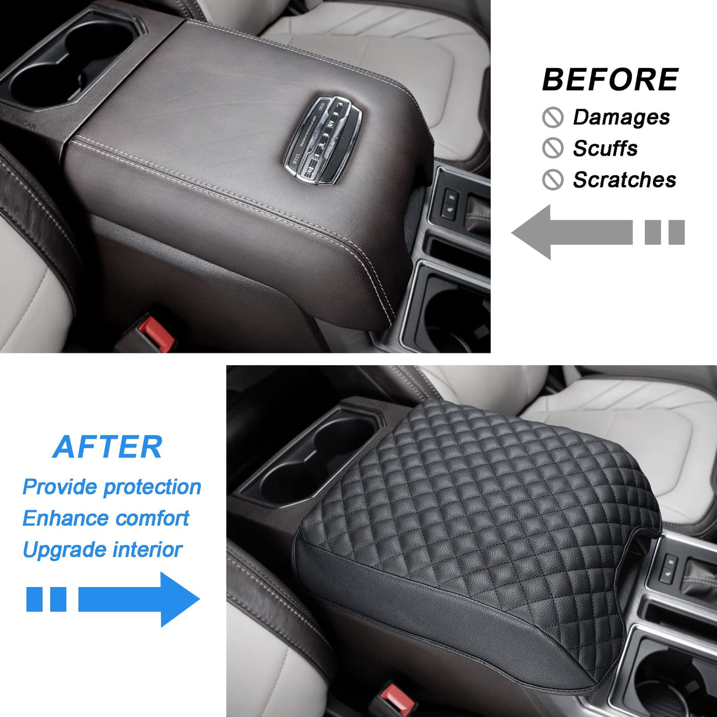 CUSTOM DESIGN: The center console cushion is designed for Ford F150 2015-2020, F250 2017-2022, F350 2017-2022, F450 2017-2022, Expedition 2018-2023 (Bucket Seat Only, Not for jump seat console or 2021 2022 F150) | PROVIDE PROTECTION: The center console cushion protect your car armrest lid from damage, scuffs, dust, scratches, and pet claws. | ENHANCE YOUR ARMREST COMFORT: This center console cushion is made of soft and smooth high-quality PU leather, making it comfortable enough for your armrest. Give your arm deserves for long comfortable drives. | QUALITY LEATHER CONSOLE COVER: Nicely padded and well stitched. The cushion is comfortable and adds a really nice touch to the interior of your F150 truck. Making your truck look unique and more fashionable. | EASY INSTALLATION: Please watch our installation video or instruction. Two flexible elastic bands on the back go under the lid to fix the cushion on the center console of the vehicle. No tools or adhesives are required.