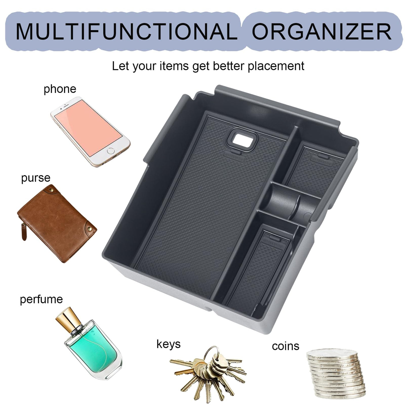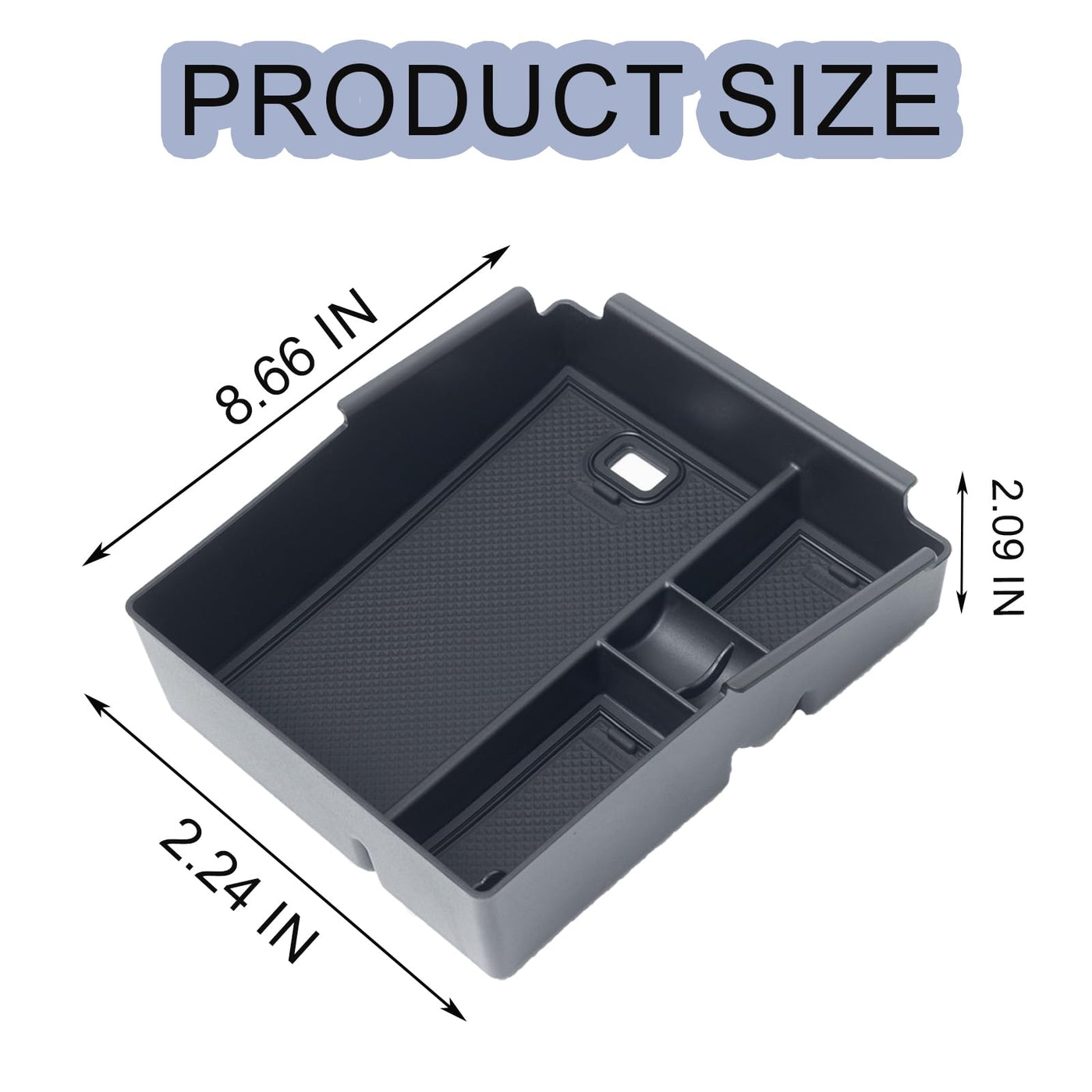Q: What materials is the center console tray made from?A: The center console tray is made from high-quality ABS plastic, featuring a matte finish and non-slip rubber pads to prevent items from sliding and rattling during travel.