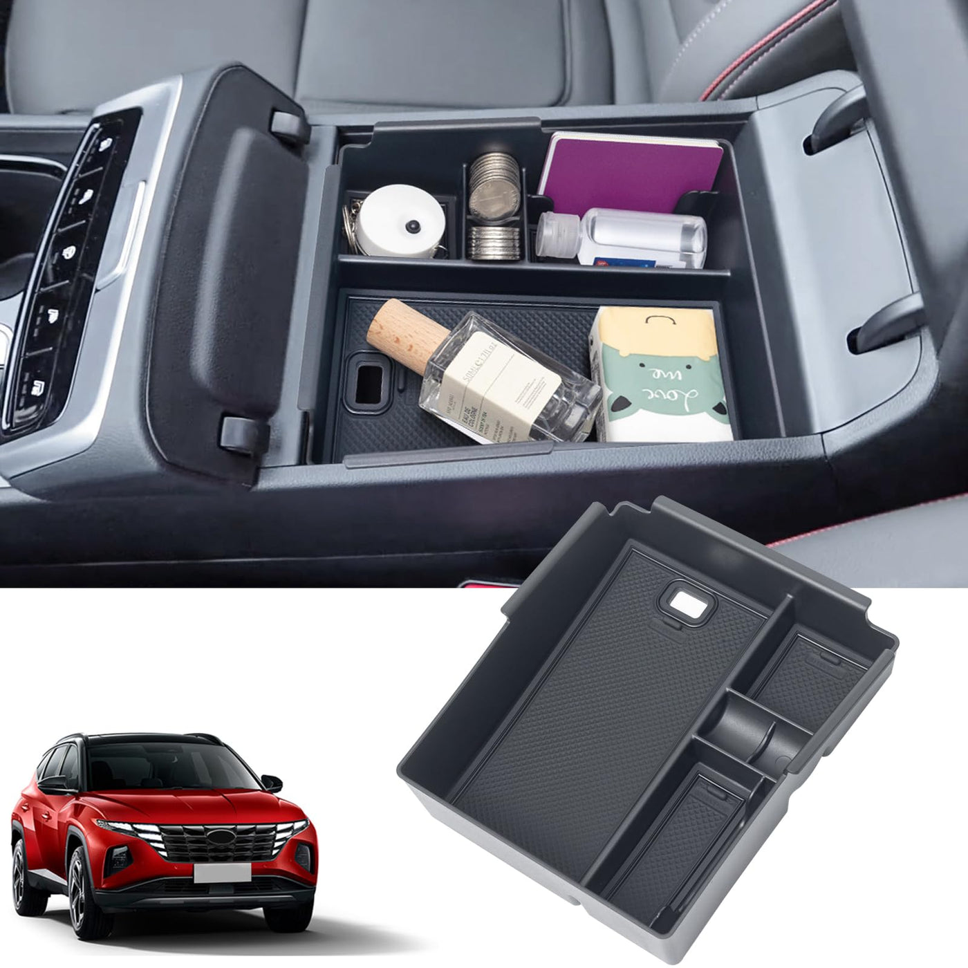 Tucson: Fits for 2022 2023 2024 Tucson Limited / 2022 2023 2024 Tucson Hybrid with (Push Button Transmission) electronic version of automatic transmission ONLY.Also fit for Tucson Hybrid SEL (NOT FIT FOR Tuscon SEL, SE, N Line, or below with stick shifter transmission). | Santa Cruz: Fits for 2022 2023 2024 Hyundai Santa Cruz (NOT fit for Santa Cruz Limited). | EXTRA SPACE: Adds an extra layer of storage, you can hold some smaller items on top, and there is also space underneath it to put larger things that you don’t need very often. | CUSTOM DESIGN: Provides a convenient hole through the back of the organizer where you can route your cord for a phone charger cable. | HIGH QUALITY: This center console tray is made of high-quality ABS plastic material with a matte finish and non-slip rubber pads which keep things from sliding around and rattling inside.