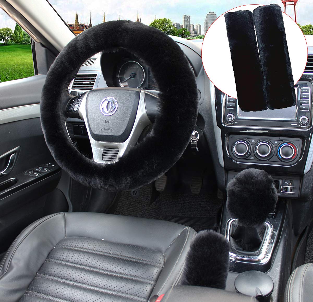 Q: Can I use this set for other vehicles?A: Absolutely! This set is designed to be universally compatible, making it suitable for most vehicles. It includes a steering wheel cover, a shift cover, a handbrake cover, and two seat belt shoulder pads.