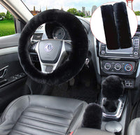 Pinbola 5Pcs In 1 Set Faux Wool Steering Wheel Cover Soft Fluffy Handbrake Cover & Gear Shift Cover & 2Pcs Seat Belt Shoulder Pads Warm Universal Fit For 15 Inch (Black)