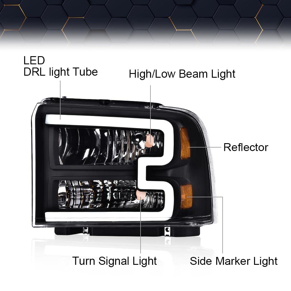 Pit66 Led Drl Headlight Compatible With Ford F250 F350 F450 F550 Super Duty 2005-2007/Compatible With Excursion 2005 6C3Z13008Db,6C3Z13008Cb Clear Lens Black Housing Amber Reflector