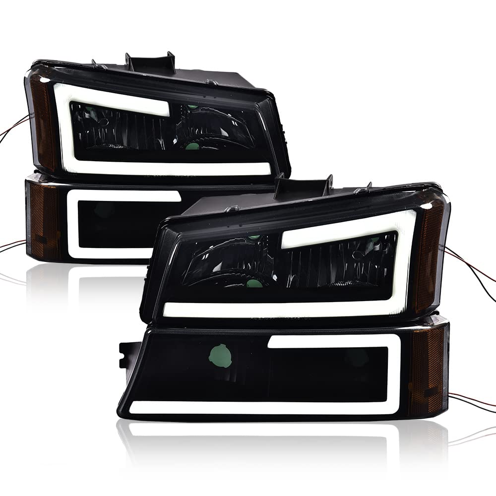 Pit66 Led Headlight, Compatible With 03-06 Chevy Silverado 1500 2500 3500 Hd Model/ Fit For 03-06 Avalanche 1500 2500(Fit No Cladding Only) Smoky Lens Black Housing Amber Corner