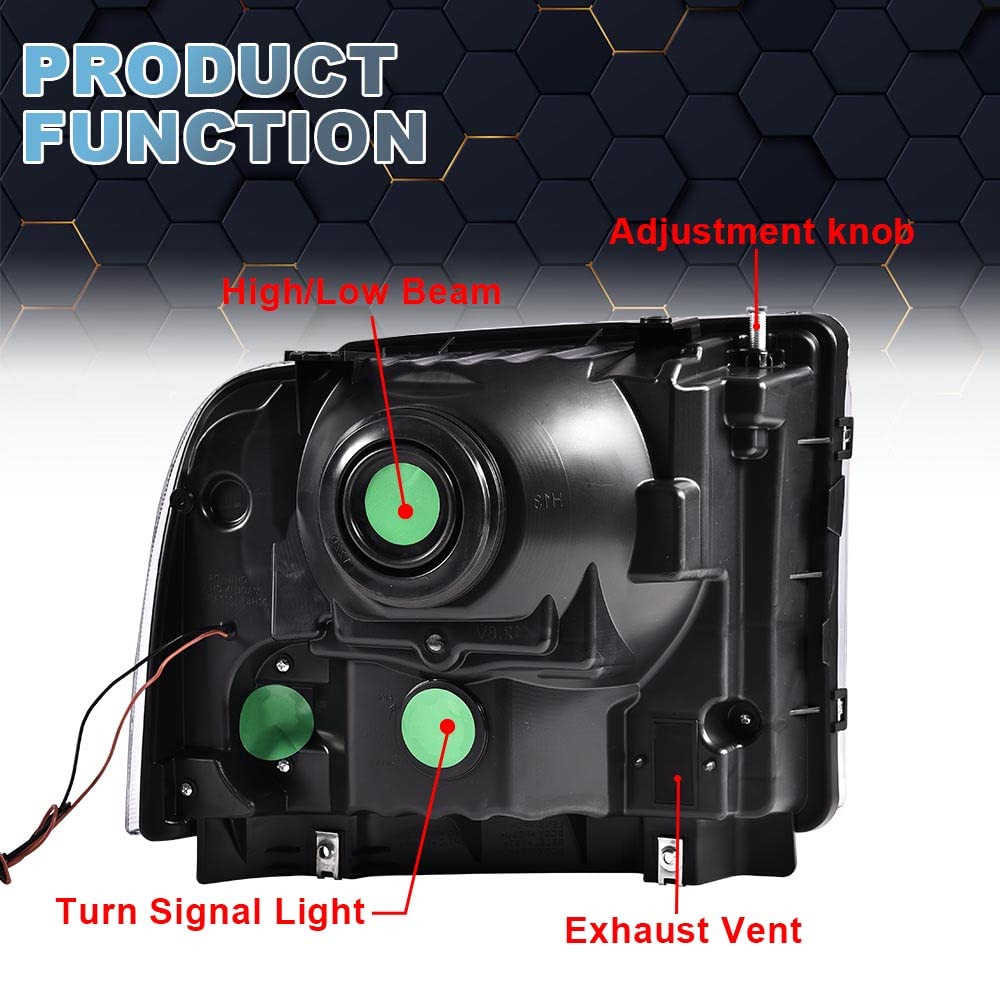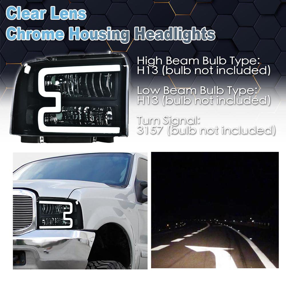 Application: Compatible With Ford Excursion 05 ( Us Models Only ) Compatible With Ford F-250 Super Duty 05-07 Compatible With Ford F-350 Super Duty 05-07 Compatible With Ford F-450 Super Duty 05-07 Compatible With Ford F-550 Super Duty 05-07 Note:Do Not Fit With Sealed Beam Headlight Model Description: Low/High Beam Bulb Type : H13 Turn Signal Light Bulb Type : 3157A Side Marker Light Bulb Type : 194Na Parking Light Bulb Type : 3157A Interchange Part Number: 6C3Z13008Ab,6C3Z13008Bb,6C3Z13008Cb,6C3Z13008Db Material:Abs Plastic/Polycarbonate Lens Bulbs Included:No Bringing A Different Appearance To Veichle Or To Replace Old And Worn Headlights About Installation Problems: Professional Installation Is Highly Recommended,Installation Instruction Is Not Included. Direct Bolt-On Oe Fitment Or Compatible With The Stock Unit Require No Modificaion Or Drilling Package Includes: 2Pcs*Headlights (Driver And Passenger Side)