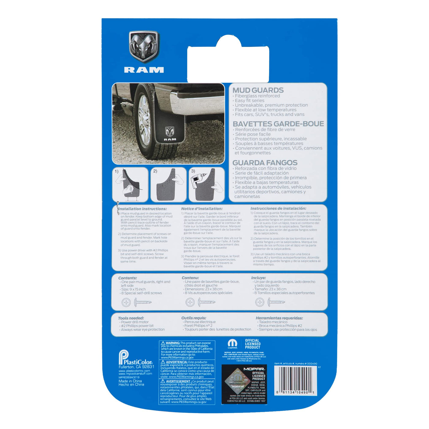 PlastiColor Dodge Ram Logo Easy Fit Mud Guards are the most colorful and durable flaps with a patented, fiberglass backing that not only keeps them from cracking or splitting, but also adds " memory" to keep their shape. They are also made of a specially formulated PVC that will easily withstand sub-zero temperatures and extreme heat without cracking. These " Easy Fit" mud guards feature an easy-to-install design, and includes all the necessary hardware which facilitates easy installation.