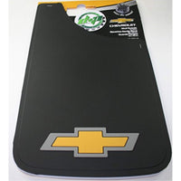 Universal Easy Fit Black Rubber Mud Guards with Gold Chevy Bowtie Logo by Plastic color, 1 Pair. Location: Front or Rear. Size: 11 W x 19 L. Mud Guards are colorful and durable flaps with a patented, fiberglass backing that not only keeps them from cracking or splitting, but also adds memory to keep their shape. Plastic color mud guards are also made of a specially formulated PVC that will easily withstand sub-zero temperatures and extreme heat without cracking.