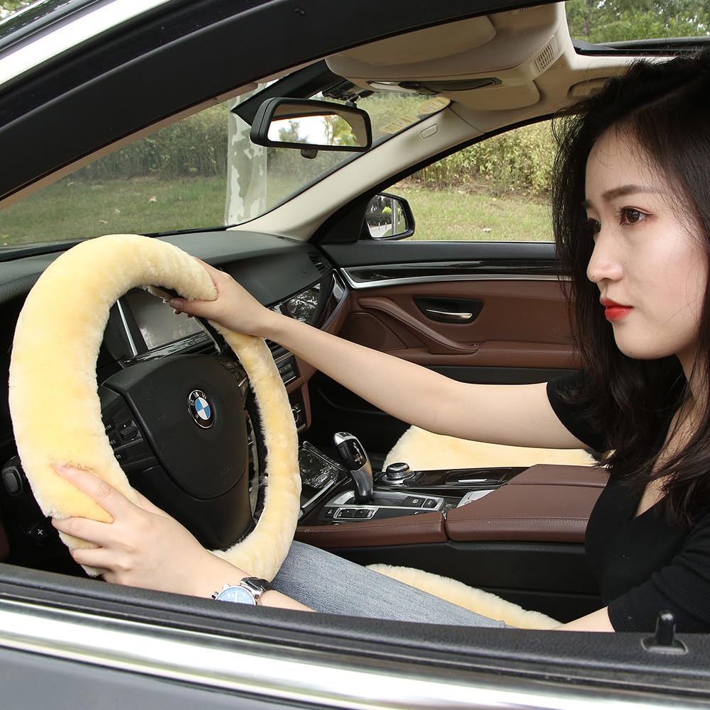 Q: What are the benefits of using a sheepskin steering wheel cover?A: A sheepskin steering wheel cover provides natural warmth in winter and cooling in summer, enhances grip, absorbs moisture, and adds a luxurious feel to your driving experience, contributing to overall driving comfort.