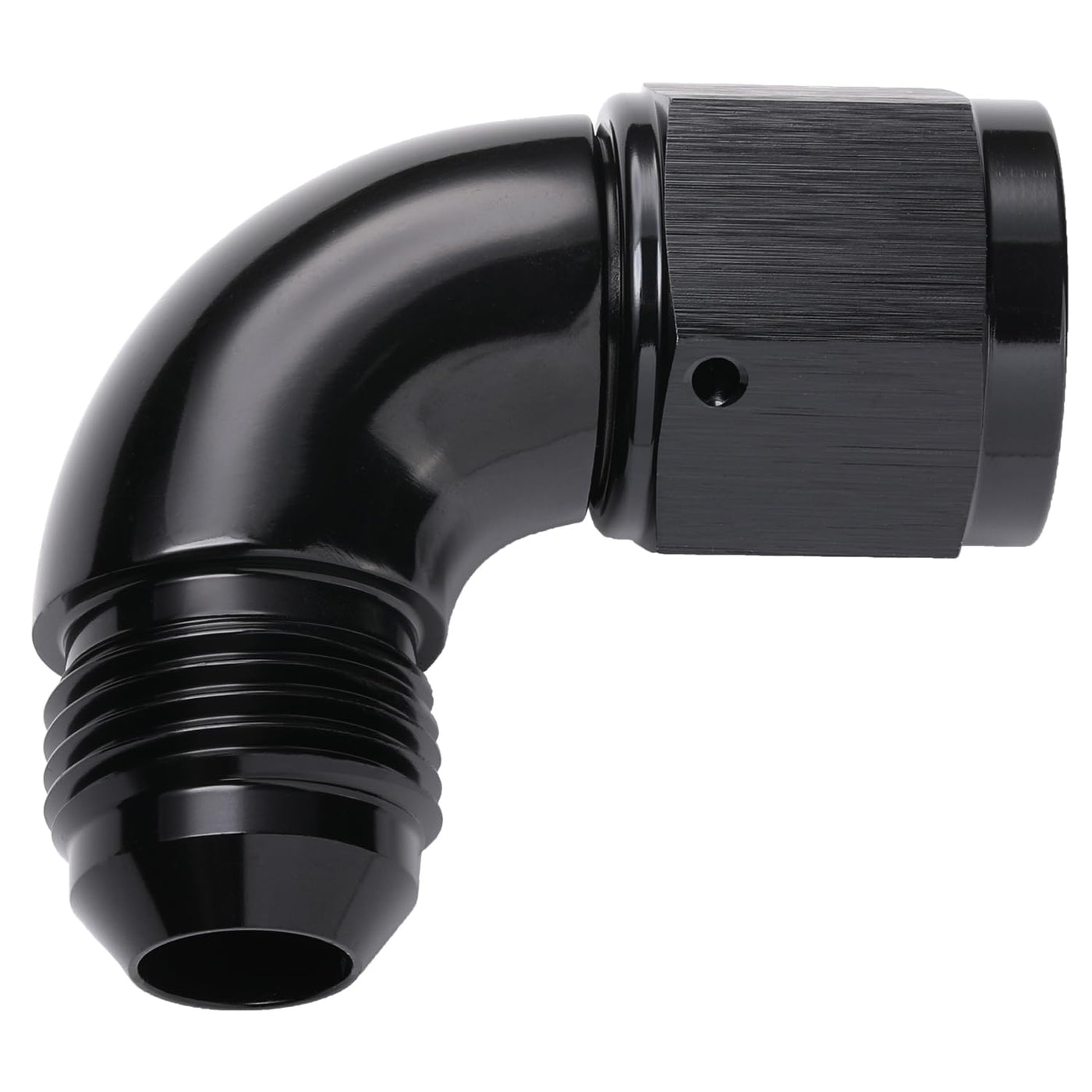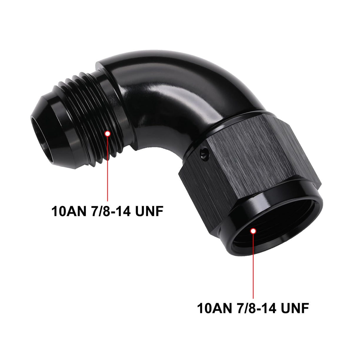 Specifications: Material: 6061 T6 billet Aluminum Size: 10AN (7/8x14 UNF) female swivel to male, 90 degree Surface Treatment: Anodized black Features: - 37 sealing angle guarantees a positive seal at maximum operating pressures - Universal fit for fuel, oil, diesel or water lines - The forged full flow construction has a superior wall thickness and provides an uninterrupted flow - All Podavelle fittings and adapters are fully compatible with gasoline and alcohol based fuels Notice: Professional installation is highly recommended! (No instructions included)