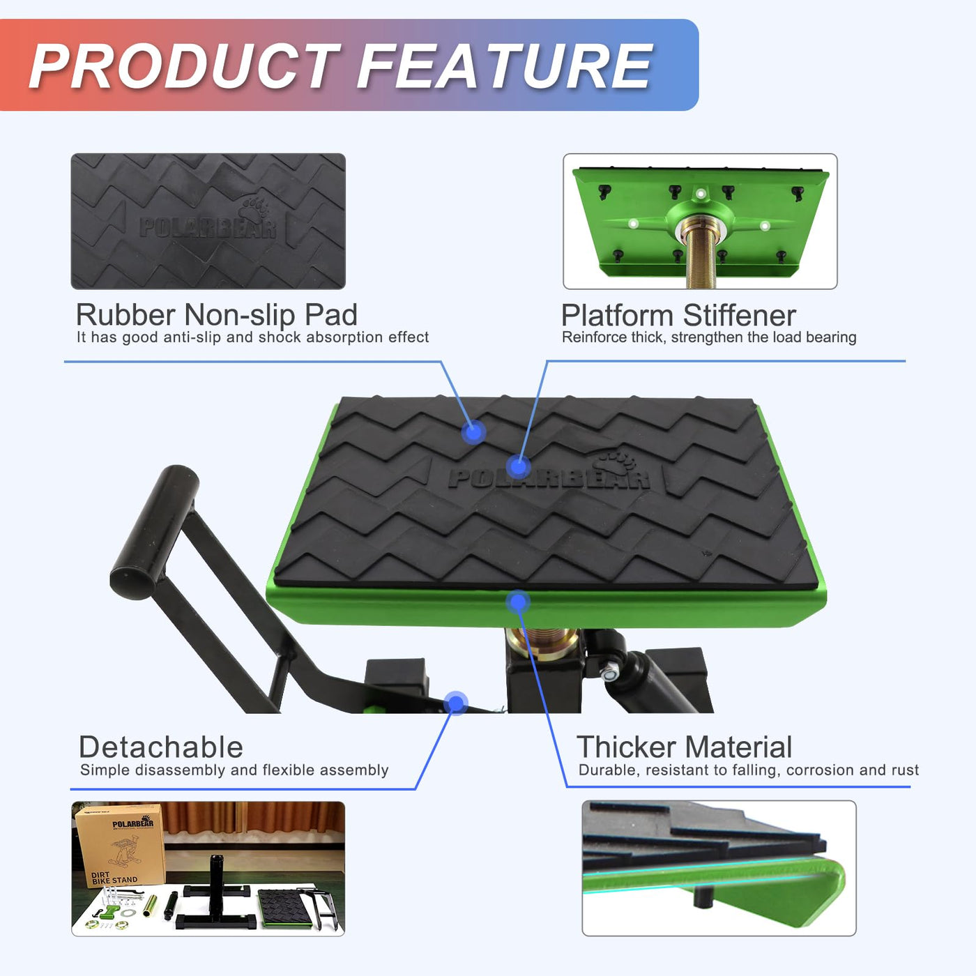 Q: How do I care for and maintain the POLARBEAR Dirt Bike Stand?A: To maintain the POLARBEAR stand, regularly check for any signs of wear or damage. The components can be disassembled for simple repairs, and the rubber gasket should be kept clean to ensure the anti-slip design functions effectively.