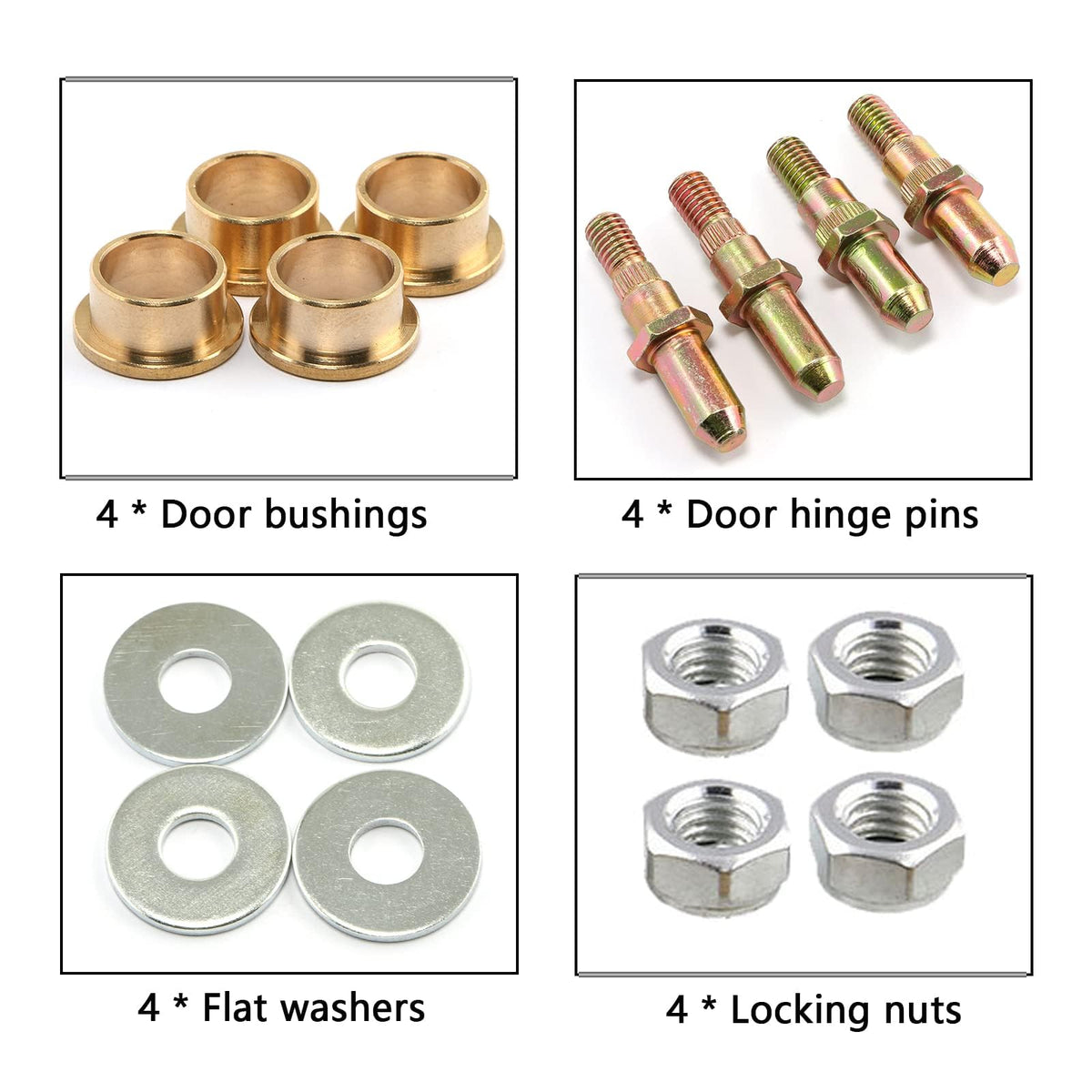 Specifications: Name: Door Hinge Roller Pin Material: Zinc Plated Steel Color: Metallic Gold Part Number: Replace 19299324 8902553 38453p Compatible with: Compatible with 1999-2007 Chevy Avalanche Base Compatible with 2002-2006 Chevy Avalanche SUT Base Compatible with 2000-2006 Chevy Avalanche SUV Base Compatible with 1999-2007 Chevy Silverado Base Compatible with 1999-2006 Chevy Silverado 2500 Base Compatible with 2001-2006 Chevy Silverado 3500 Base Compatible with 1999-2007 Chevy Silverado SS Compatible with 1999-2007 Chevy Suburban Base Compatible with 2000-2006 Chevy Tahoe 4DR Base Compatible with 1999-2007 Chevy Tahoe Base Compatible with 2006-2007 GMC Sierra Base Compatible with 2006 GMC Sierra C3 Compatible with 2007 GMC Sierra 2500 Base Compatible with 2007 GMC Sierra 3500 Base Compatible with 1999-2007 GMC SierraCompatible with 2006 GMC Yukon 4DR Base Compatible with 2002-2006 GMC Yukon, Yukon XL, Yukon Denali & Yukon Denali XL Compatible with 2002-2006 Cadillac Escalade ESV & EXT Please check your car models before buying. Please Note: Does not fit 2001-2004 Tahoe, Suburb Package Including: 4 * Door hinge pins 4 * Door bushings 4 * Flat Washers 4 * Locking Nuts