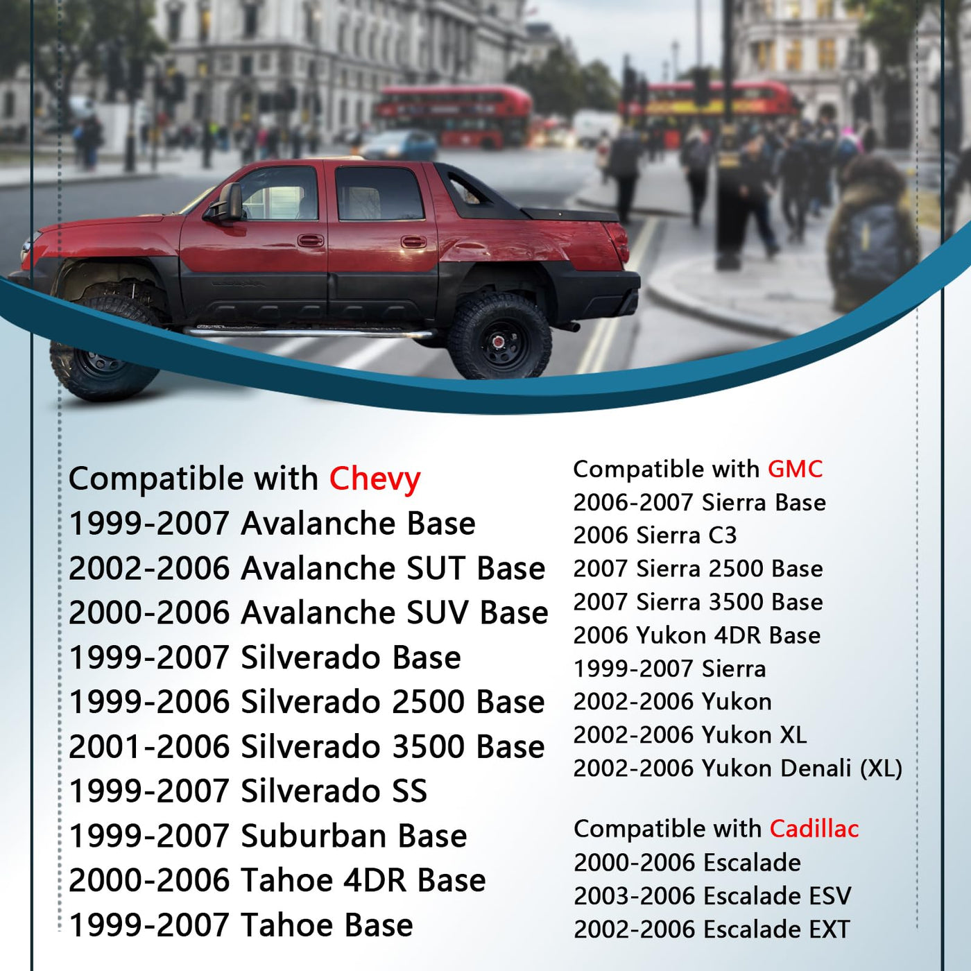 Q: What vehicles are compatible with the POSENG Door Hinge Roller Pin and Bushing Repair Kit?A: The POSENG Door Hinge Roller Pin and Bushing Repair Kit is compatible with various models including the 1999-2007 Chevy Avalanche, Silverado, Suburban, Tahoe, and GMC Sierra and Yukon, as well as the 2002-2006 Cadillac Escalade ESV and EXT. Please verify your vehicle's model and year before purchasing.