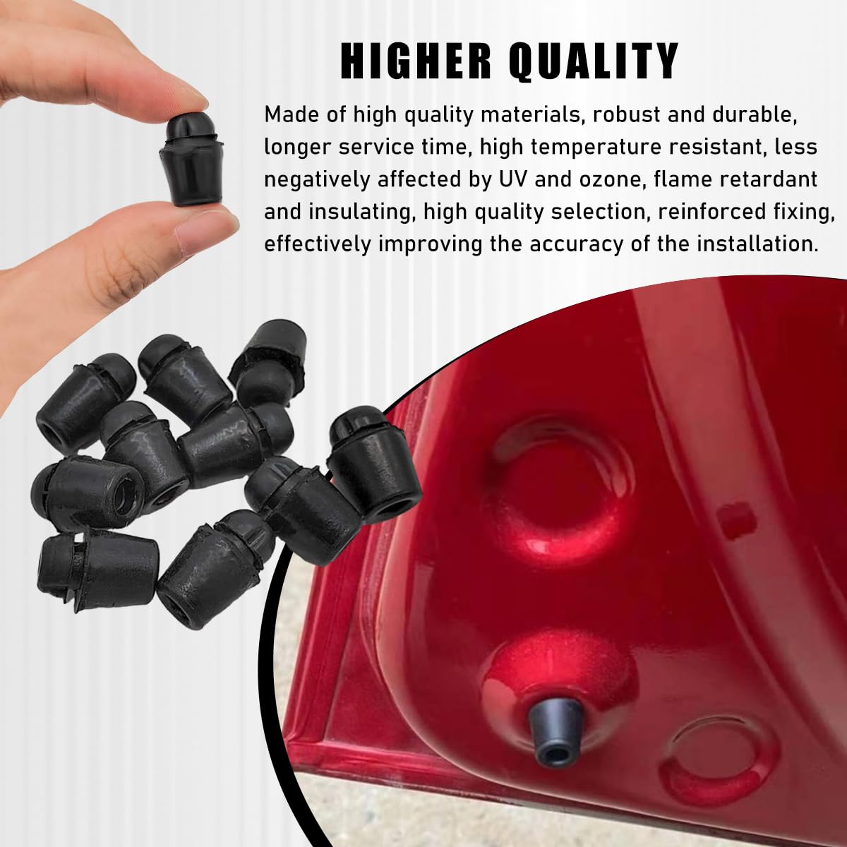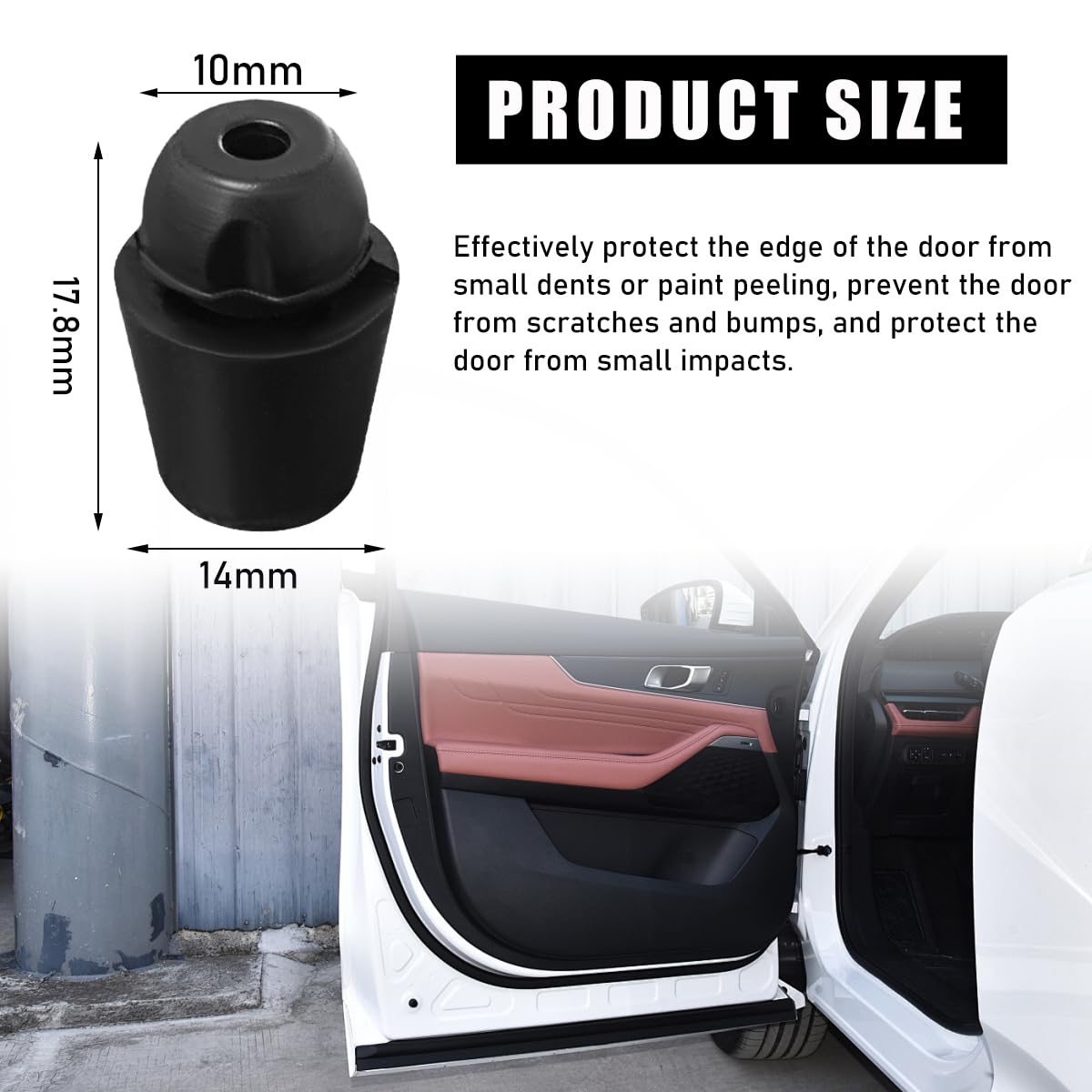 Specification: Material: Rubber Quantity: 10 PCS Color: Black Weight: 25 g Size: 0.55 0.7 inches Feature: Practical, Durable, Noise Reducing OEM Number: 82191-28010 Other benefits of this product: -The quantity is sufficient and the size is compact, so you can keep it in your trunk or toolbox for emergency replacing. -It absorbs impact and reduces direct contact between the door and the frame, minimizing damage and thus prolonging the service time of your car door. -Its wear-resistant properties ensure long-lasting protection for your car door. -It is an ideal replacement for old or broken cushioning pads, and it saves money and effort to replace them yourself.