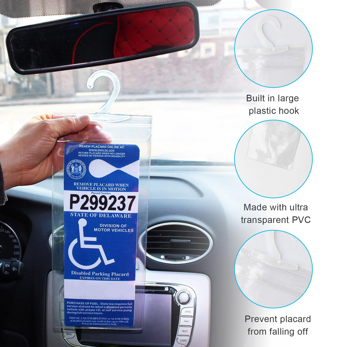 Specifications: Color: Transparent Quantity: 3/ 4 PCS Material: PVC Size: 11.6 5 inches Weight: 25 g Feature: Clear, Flexible, Durable Applicability: Universal Why use this disability sign holder? -It is designed according to the sizes of handicap parking permit signs in different states and is suitable for most states ' handicap signs. -It is easy to put on and take off, which won 't pull on mirrors or hooks and cause breakage. -It is made of soft plastic and is flexible enough to bend at will.