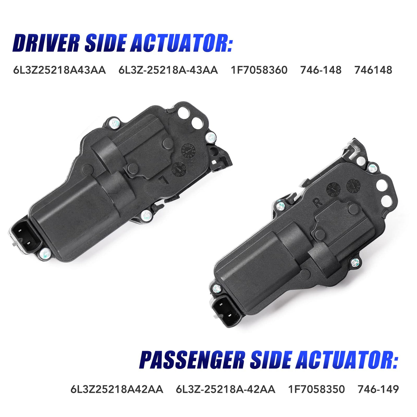 Q: What are the replacement part numbers for this actuator?A: The replacement part numbers for the driver side actuator include 6L3Z25218A43AA, 746-148, and 1F7058360. For the passenger side actuator, part numbers include 6L3Z25218A42AA and 746-149.