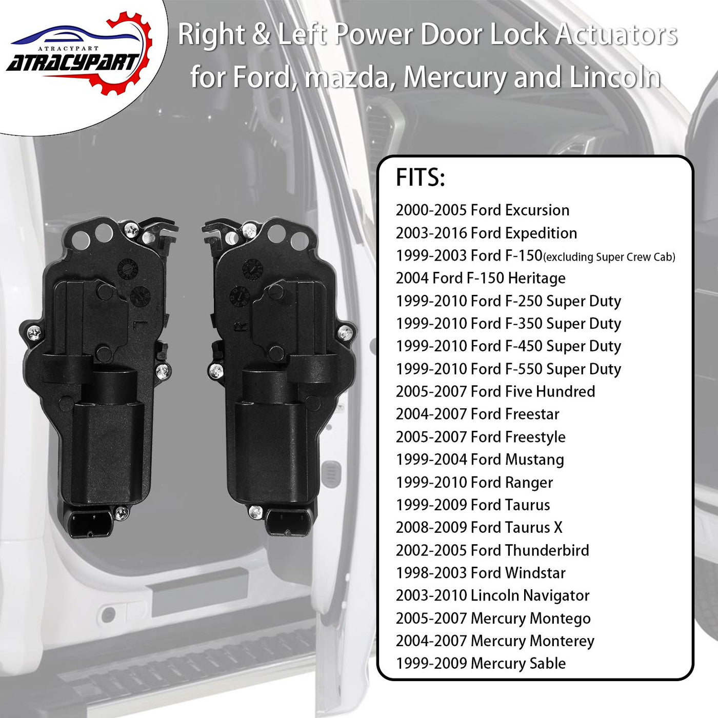 Package Includes: 1 Pair of Power Door Lock Actuators (Left+Right) Compatible Vehicles: 2000-2005 Ford Excursion 2003-2016 Ford Expedition 1999-2003 Ford F-150 (excluding Super Crew Cab) 2004 Ford F-150 Heritage 1999-2010 Ford F-250 Super Duty 1999-2010 Ford F-350 Super Duty 1999-2010 Ford F-450 Super Duty 1999-2010 Ford F-550 Super Duty 2005-2007 Ford Five Hundred 2004-2007 Ford Freestar 2005-2007 Ford Freestyle 1999-2004 Ford Mustang 1999-2010 Ford Ranger 1999-2009 Ford Taurus 2008-2009 Ford Taurus X 2002-2005 Ford Thunderbird 1998-2003 Ford Windstar 2003-2010 Lincoln Navigator 2005-2007 Mercury Montego 2004-2007 Mercury Monterey 1999-2009 Mercury Sable Front and Rear Left ( Driver Side ) Replaces OE#: F81Z-25218A43-AA, F81Z25218A43AA, 3L3Z25218A43AA, 3L3Z-25218A-43AA 6L3Z25218A43AA, 6L3Z-25218A-43AA, 746-148, 1F7058360, 1F8058360 Front and Rear Right ( Passenger Side ) Replaces OE#: F81Z-25218A42-AA, F81Z25218A42AA, 3L3Z25218A42A, 3L3Z-25218A-42A 3L3Z25218A42AA, 3L3Z-25218A-42AA, 6L3Z25218A42AA, 6L3Z-25218A-42AA F88Z16219A64-BB, F88Z16219A64BB, 746-149, 1F7058350, XF2Z218A42DA, 1F8058350, ZZR058350 Quality Guarantee: 12-Month Warranty At ATRACYPART, we take pride in the quality of our products and in your satisfaction. If you have any problems, do not hesitate to contact us.