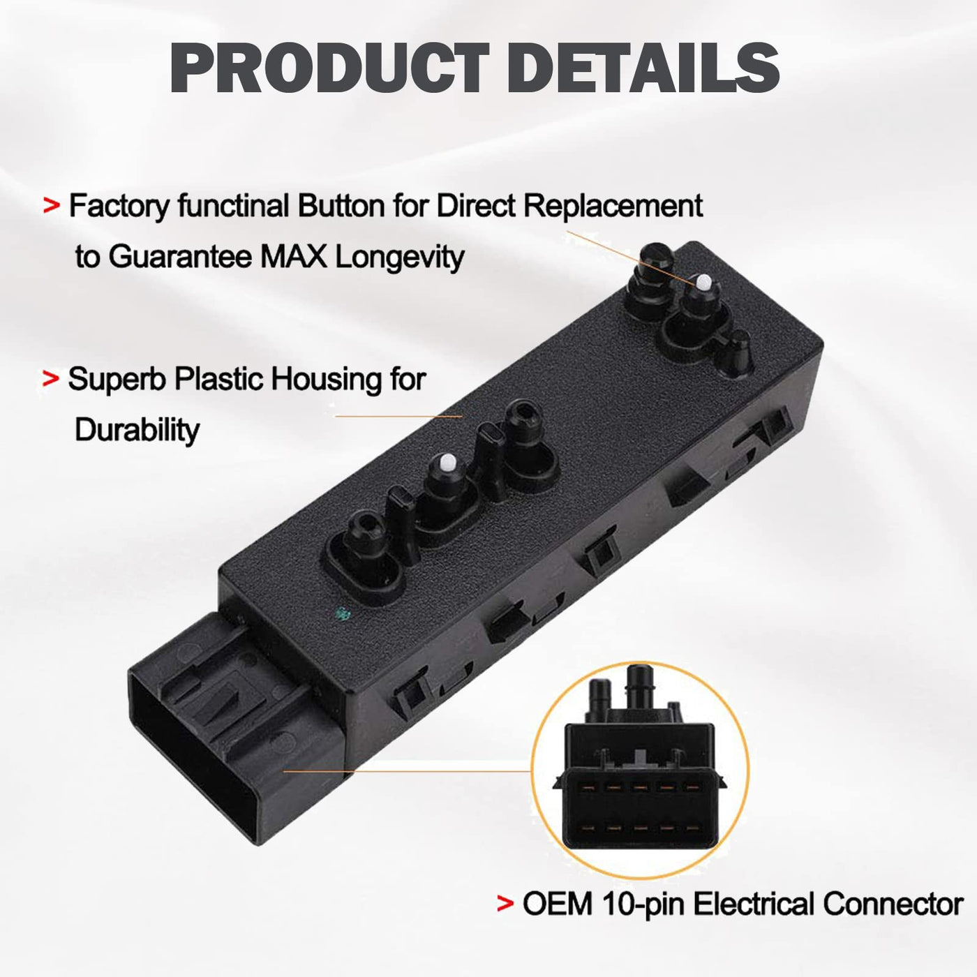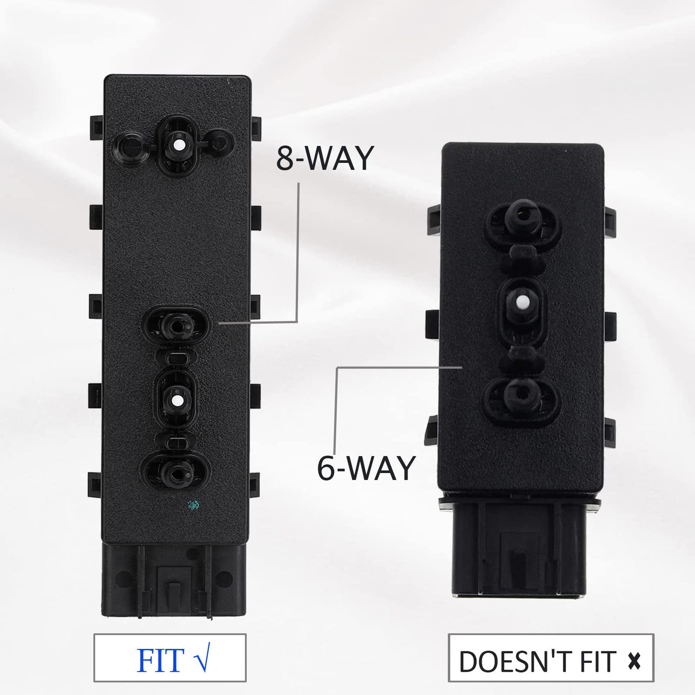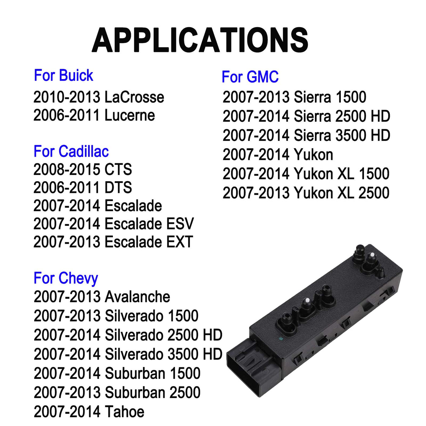 Position -- front right side; passenger side Part Number -- 12451498; 1245-1498 Seat Switch 25974715 Seat Switch 1S12379 Seat Switch PSW151 Seat Switch PSW148 Seat Switch for Standard Ignition PSW149 Seat Switch Fitment Compatible with Buick 2010-2013 Buick LaCrosse Power Seat Switch 2006-2011 Buick Lucerne Power Seat Switch Compatible with Cadillac 2008-2015 Cadillac CTS Power Seat Switch 2006-2011 Cadillac DTS Power Seat Switch 2007-2014 Cadillac Escalade Power Seat Switch 2007-2014 Cadillac Escalade ESV Power Seat Switch 2007-2013 Cadillac Escalade EXT Power Seat Switch Compatible with Chevy 2007-2013 Chevy Avalanche Power Seat Switch 2007-2013 Chevy Silverado 1500 Power Seat Switch 2007-2014 Chevy Silverado 2500 HD Power Seat Switch 2007-2014 Chevy Silverado 3500 HD Power Seat Switch 2007-2014 Chevy Suburban 1500 Power Seat Switch 2007-2013 Chevy Suburban 2500 Power Seat Switch 2007-2014 Chevy Tahoe Power Seat Switch Compatible with GMC 2007-2013 GMC Sierra 1500 Power Seat Switch 2007-2014 GMC Sierra 2500 HD Power Seat Switch 2007-2014 GMC Sierra 3500 HD Power Seat Switch 2007-2014 GMC Yukon Power Seat Switch 2007-2014 GMC Yukon XL 1500 Power Seat Switch 2007-2013 GMC Yukon XL 2500 Power Seat Switch