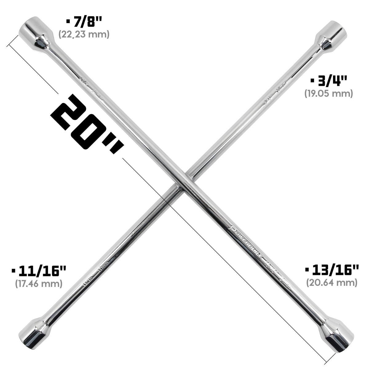 Q: What is the size and weight of the Powerbuilt lug wrench?A: The Powerbuilt 940559 lug wrench is 20 inches in length and weighs 3.5 pounds, making it compact enough for easy storage while still providing sufficient leverage for tire repairs.