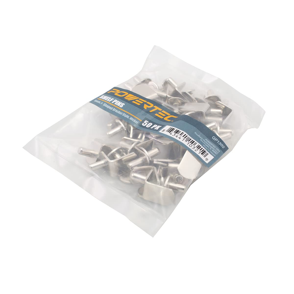 The POWERTEC QP1302-P2 5mm L-Shaped Bracket Style Shelf Pins, Nickel, 100PK, provide a reliable solution when you need durable, well-made, and finely finished pins for your new or existing shelving and cabinetry.