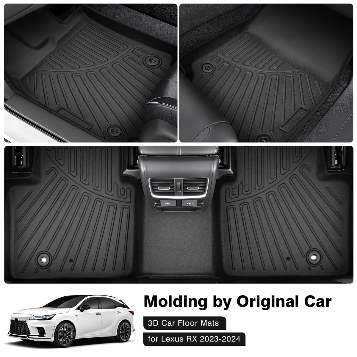 Compatible with Lexus RX 2023 2024 2025 (Include RX350 RX350h RX500h) NOT for RX450h+ PHEV Feature: 1.Featuring a deeply molded, the pattern that captures and holds all dirt, water, snow and spills from hitting the carpet. 2.Better temperature resistance than PVC. The mats are non-toxic, odorless, contain no latex, cadmium, lead or any harmful PVCs. The high tensity TPE material not only feels nice and is extremely wear-resistant, but also remains flexible in extreme cold weather. 3. These floor mats also come in a multi-purpose, standard shape so they give the interior of your car the best fitting look possible. 4.All weather protection against Snow, Mud, Sand, Salt Water and More. - Spill Saver Lip (Prevents spills from reaching the carpet) 5. Custom fit precision of the mat protects your vehicles carpet floor by stopping spills and any other mess thanks to the liners raised and strengthened lip. 6.Easy to Install:.it only takes approximately 15 minutes to install,don t need any specialty tools. SPECIFICATIONS 2 x front liners (driver & passenger side) 1 x rear liner